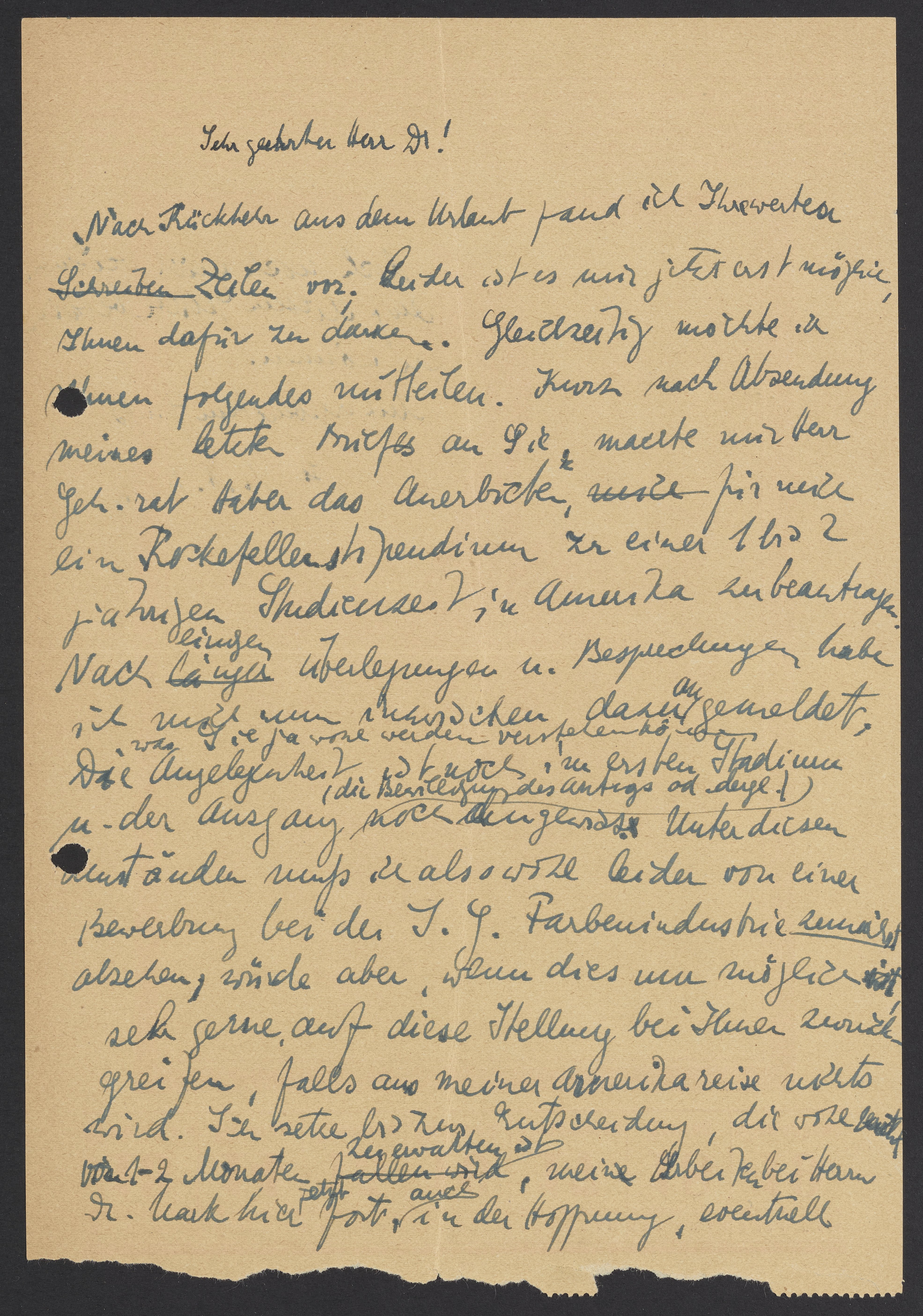 Nach Rückkehr aus dem Urlaub fand ich Ihre Zeilen vor. Leider ist es mir jetzt erst möglich, Ihnen dafür zu danken. Gleichzeitig möchte ich folgendes mitteilen. Kurz nach Absendung meines letzten Briefes an Sie, machte mir Herr Geheimrat Haber das Anerbieten mich fuer ein Rockefeller Stipendium in Amerika zu beantragen. Nach einigen Überlegungen und Besprechungen habe ich mich daher angemeldet, was sie ja wohl verstehen können. Die Angelegenheit ist noch im ersten Stadium und der Ausgang (die Bewilligung des Antrags oder dergleichen) noch ungewiss. Unter diesen Umständen muß ich also wohl leider von einer Bewerbung bei der I.G. Farbenindustrie zunächst abziehen, würde aber, wenn dies noch möglich ist, auf diese Stellung bei Ihnen zurückgreifen, falls aus meiner Amerikareise nichts wird. Ich setze bis die Entscheidung, die wohl in 1-2 Monaten zu erwarten ist, meine Arbeit bei Herrn Dr. Mark fort, auch in der Hoffnung, eventuell doch mich bei Ihnen auf diesem Gebiete betätigen zu können.