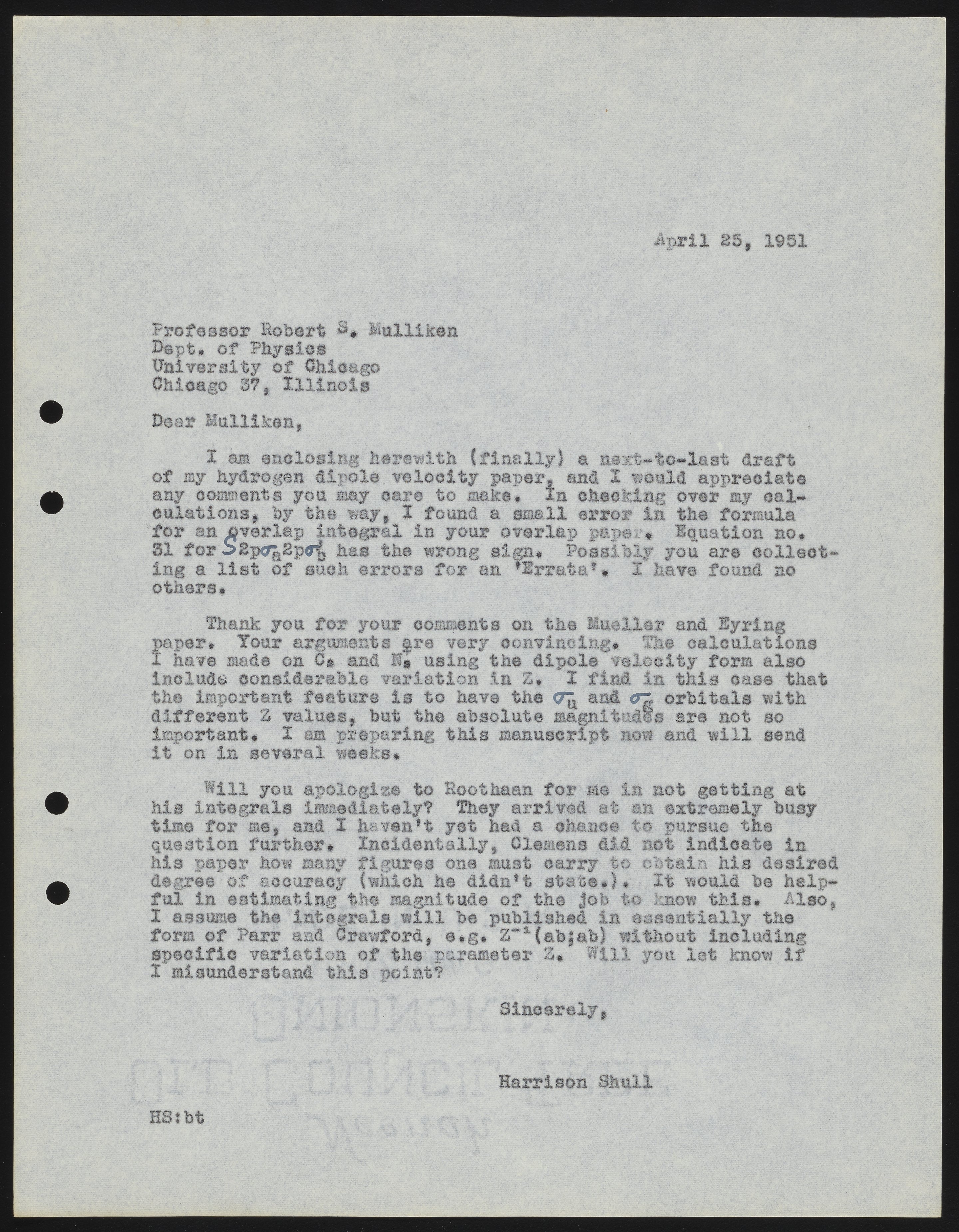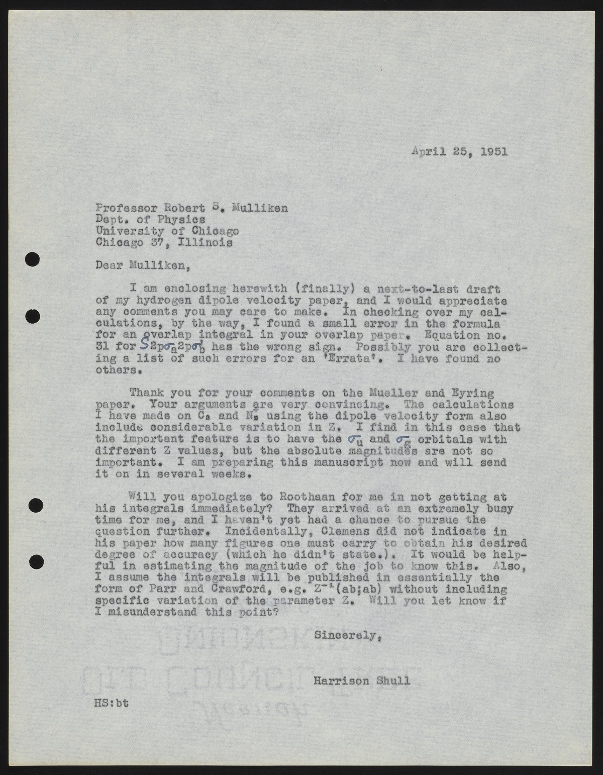 Letter from Harrison Shull to Robert S. Mulliken, 1951