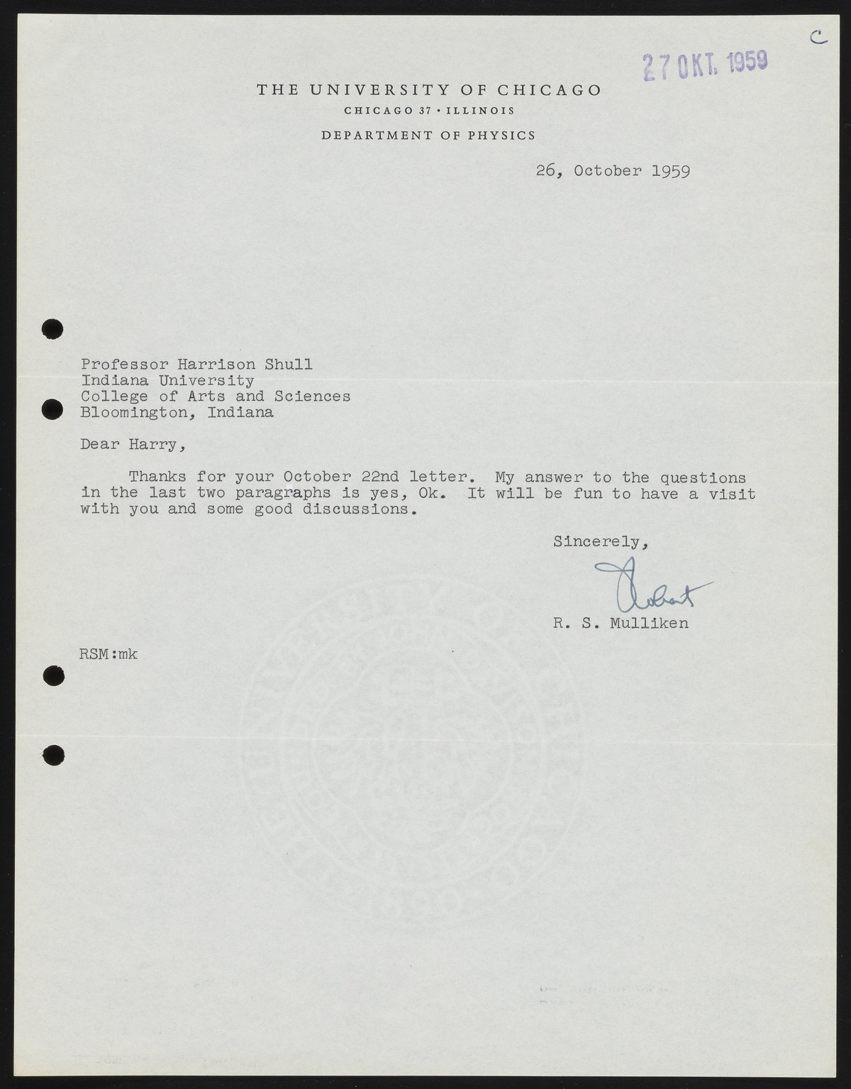 Mulliken, Robert Sanderson. “Letter from Robert S. Mulliken to Harrison Shull, 1959,” October 26, 1959. Robert S. Mulliken & Harrison Shull Correspondence, Box 1. Science History Institute. Philadelphia. https://digital.sciencehistory.org/works/br86b370j.