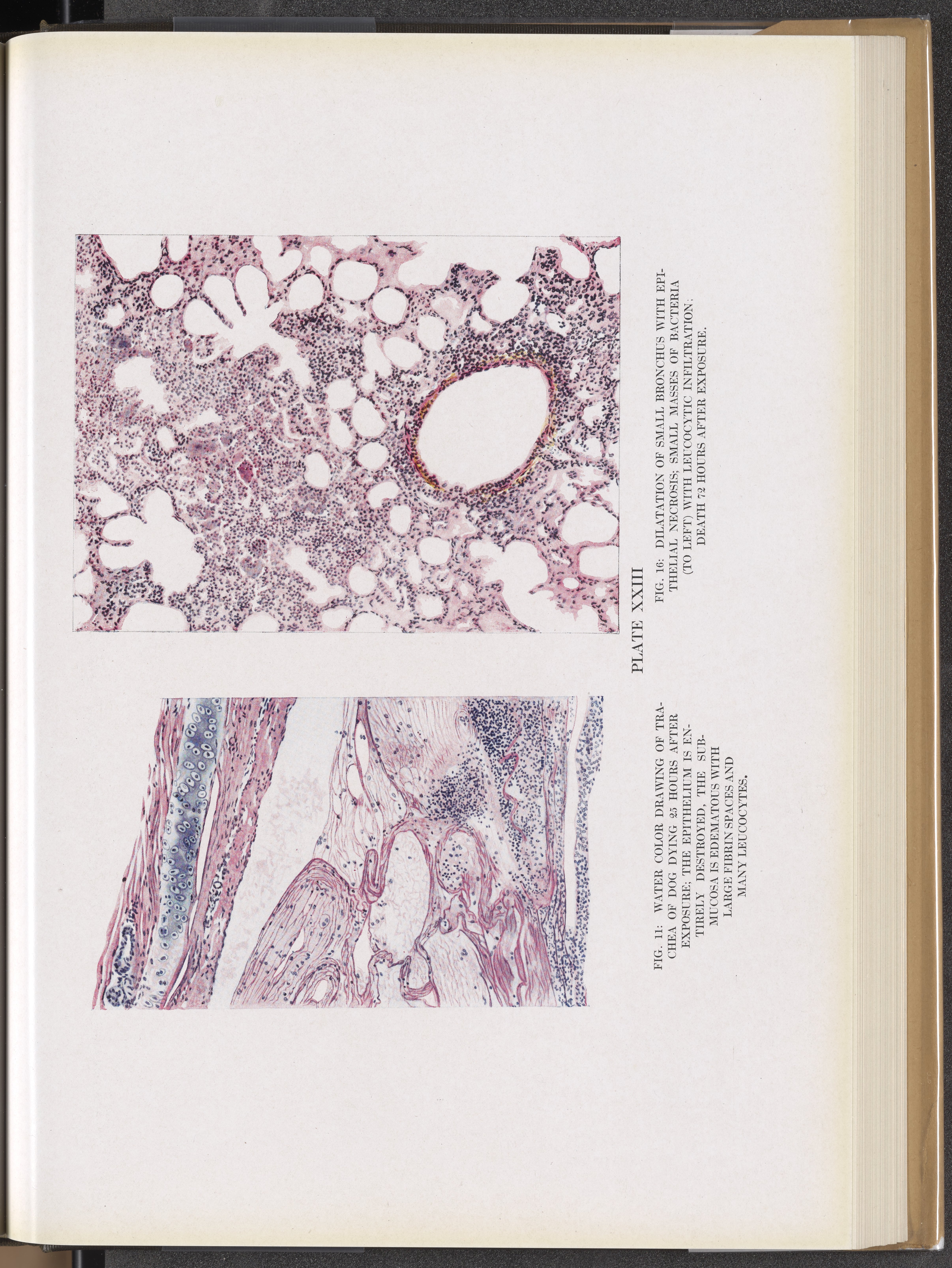 Plate XXIII (Fig. 11): Water color drawing of trachea of dog dying 25 hours after exposure; the epithelium is entirely destroyed, the submucosa is edematous with large fibrin spaces and many leucocytes. (Fig. 16) Dilatation of small bronchus with epithelial necrosis; small masses of bacteria (to left) with leucocytic infiltration; death 72 hours after exposure.