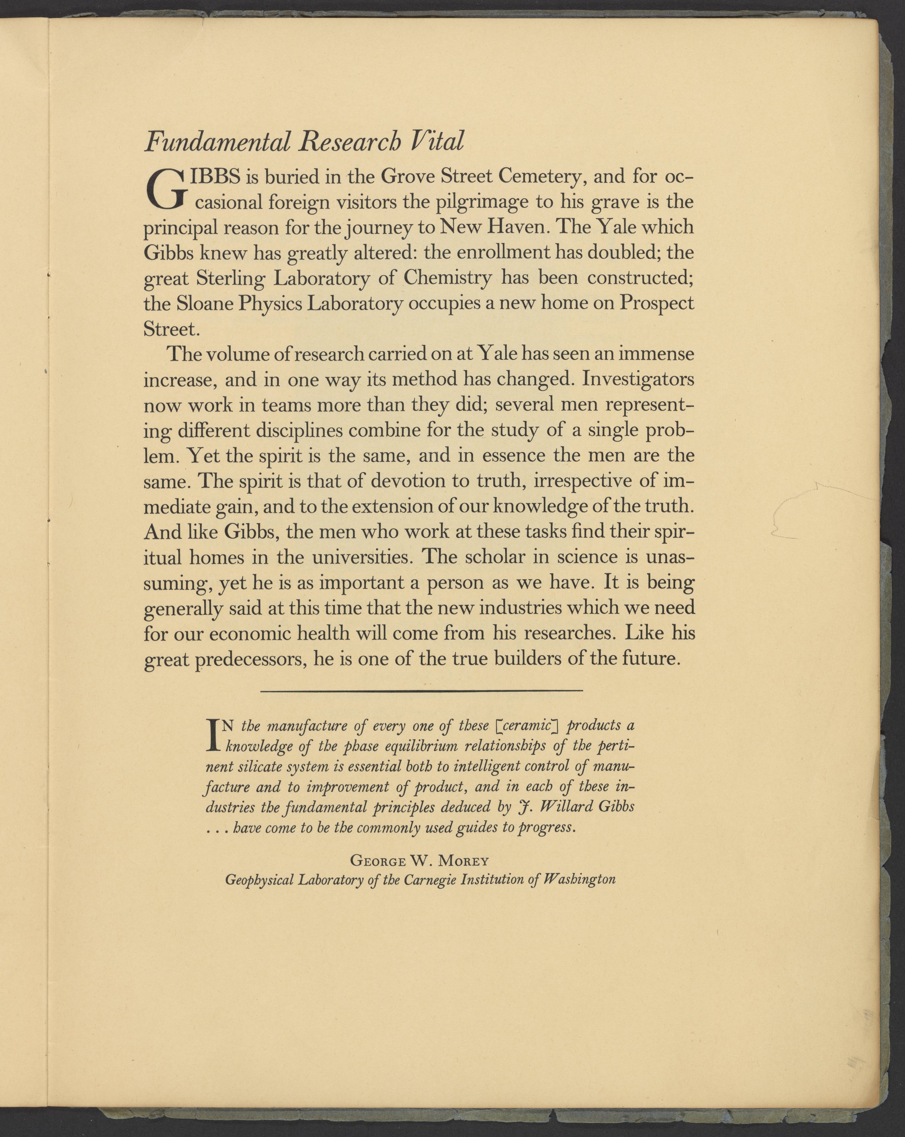 Yale University. “A Professor's Theory and It's Practical Uses: The Work of J. Willard Gibbs & Some Applications to Industry.” New Haven, Connecticut: Yale University Press, 1939. Papers of Georg and Max Bredig, Box 3, Folder 1. Science History Institute. Philadelphia. https://digital.sciencehistory.org/works/brxztg9.