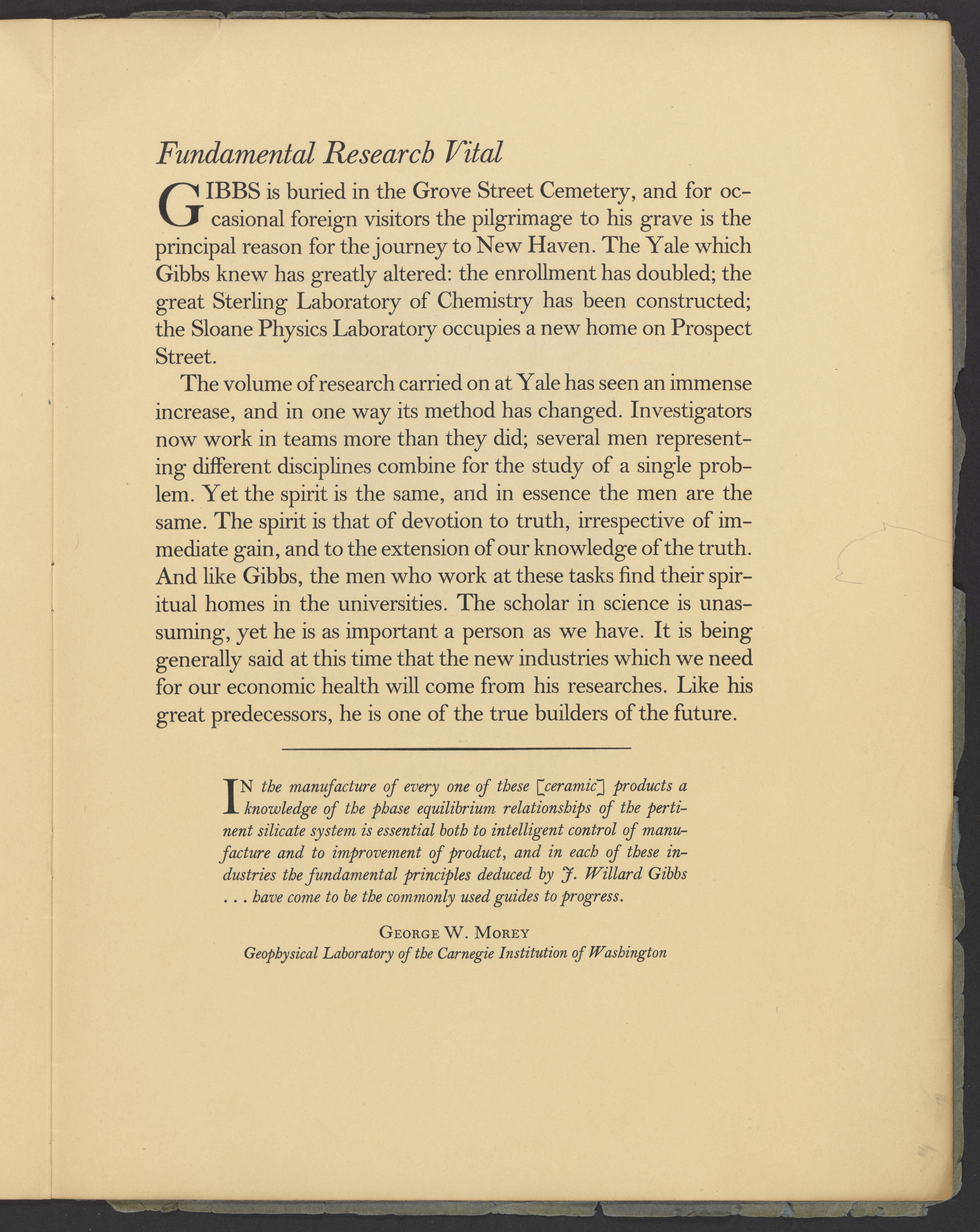 Yale University. “A Professor's Theory and It's Practical Uses: The Work of J. Willard Gibbs & Some Applications to Industry.” New Haven, Connecticut: Yale University Press, 1939. Papers of Georg and Max Bredig, Box 3, Folder 1. Science History Institute. Philadelphia. https://digital.sciencehistory.org/works/brxztg9.