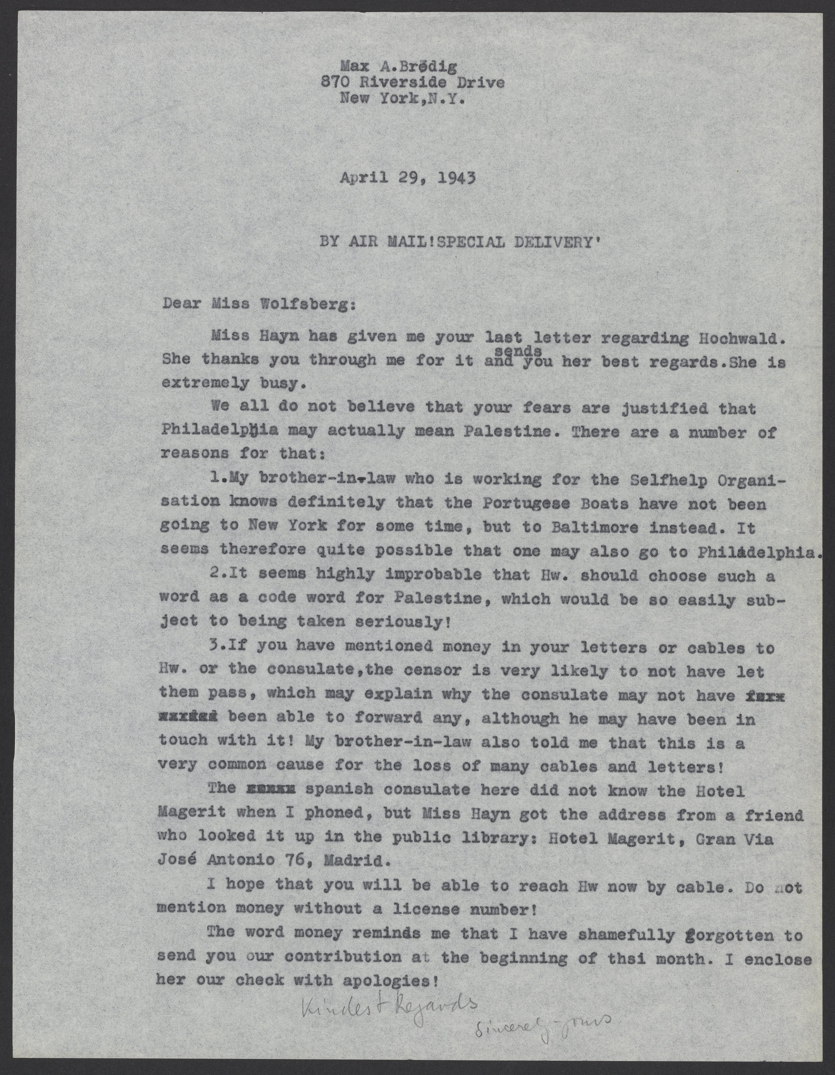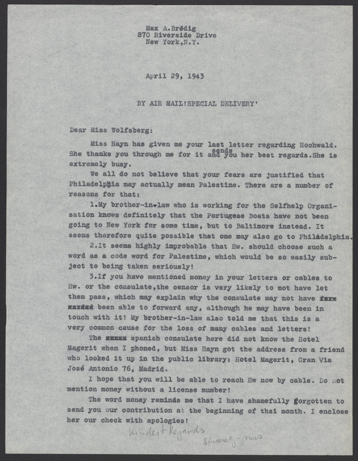 Max Bredig (1902-1977) writes to Ilse Wolfsberg regarding her fiance, Fritz Hochwald (1897-1968). Bredig warns Wolfsberg of the potential for code words within Fritz' correspondence. In particular, he emphasizes that although Fritz has stated that he will arrive in Philadelphia, there is a possibility this is code for Palestine. Bredig reminds Wolfsberg not to send money without a license number and provides her with a check.