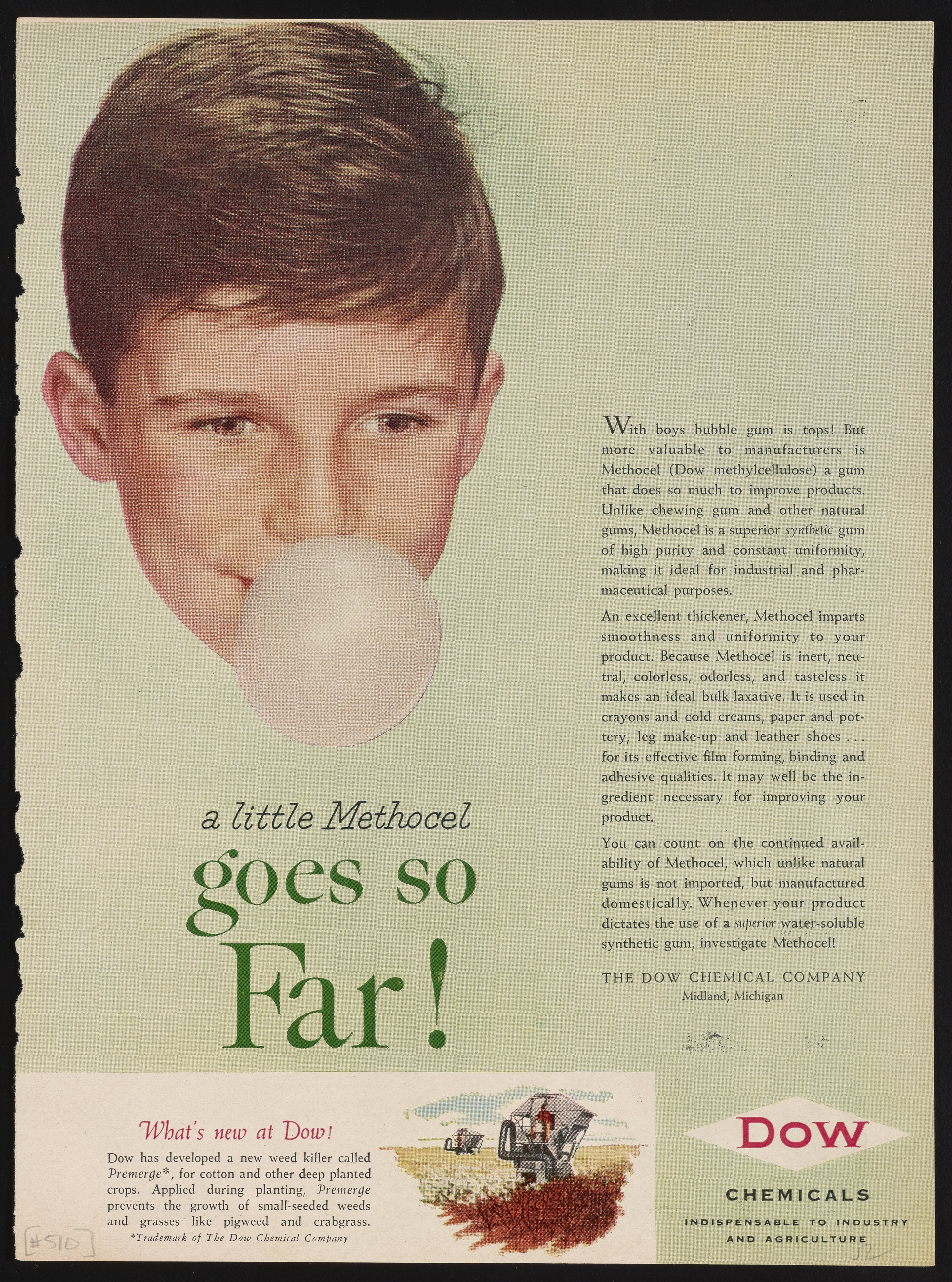 Dow Chemical Company. “A Little Methocel Goes So Far!,” 1952. Advertisements from the Dow Chemical Historical Collection, Box 9. Science History Institute. Philadelphia. https://digital.sciencehistory.org/works/bt2mw4b.
