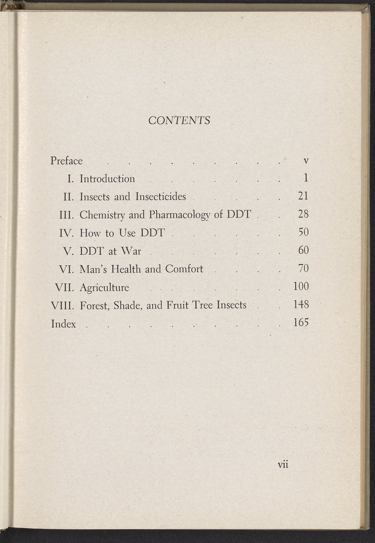 Small JPG1200 x 1682px — 486 KBFull-sized JPG2466 x 3456px — 1.8 MBOriginal fileTIFF — 2466 x 3456px — 24.4 MBVolume dedicated to summarizing the various uses, chemistry, pharmacology, history, and methods of using DDT. DDT (dichloro-diphenyl-trichloroethane) was developed as a synthetic insecticide in the 1940s. It was initially used to combat malaria, typhus, and other insect-borne diseases. The EPA banned DDT in 1972 after research showed harmful impacts to wildlife and potential human health risks.
