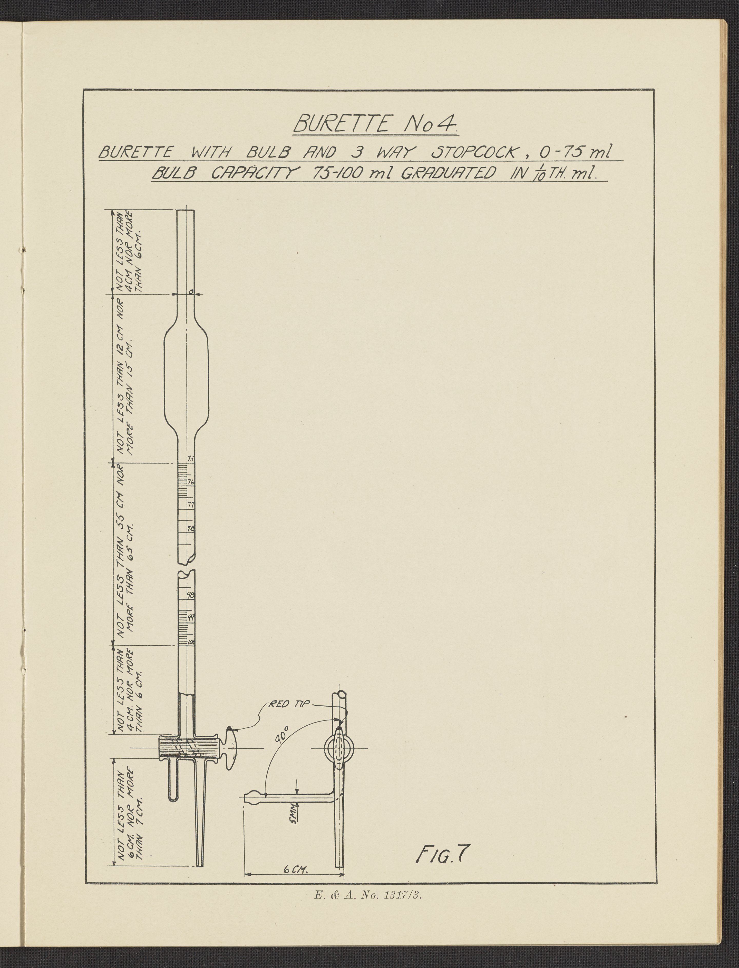“Specifications for Burette No. 4.” Standard Laboratory Apparatus Adopted by the Manufacturing Chemists Association of the United States Part 1. New York (State): Eimer & Amend, 1922. https://digital.sciencehistory.org/works/bv73c043w.