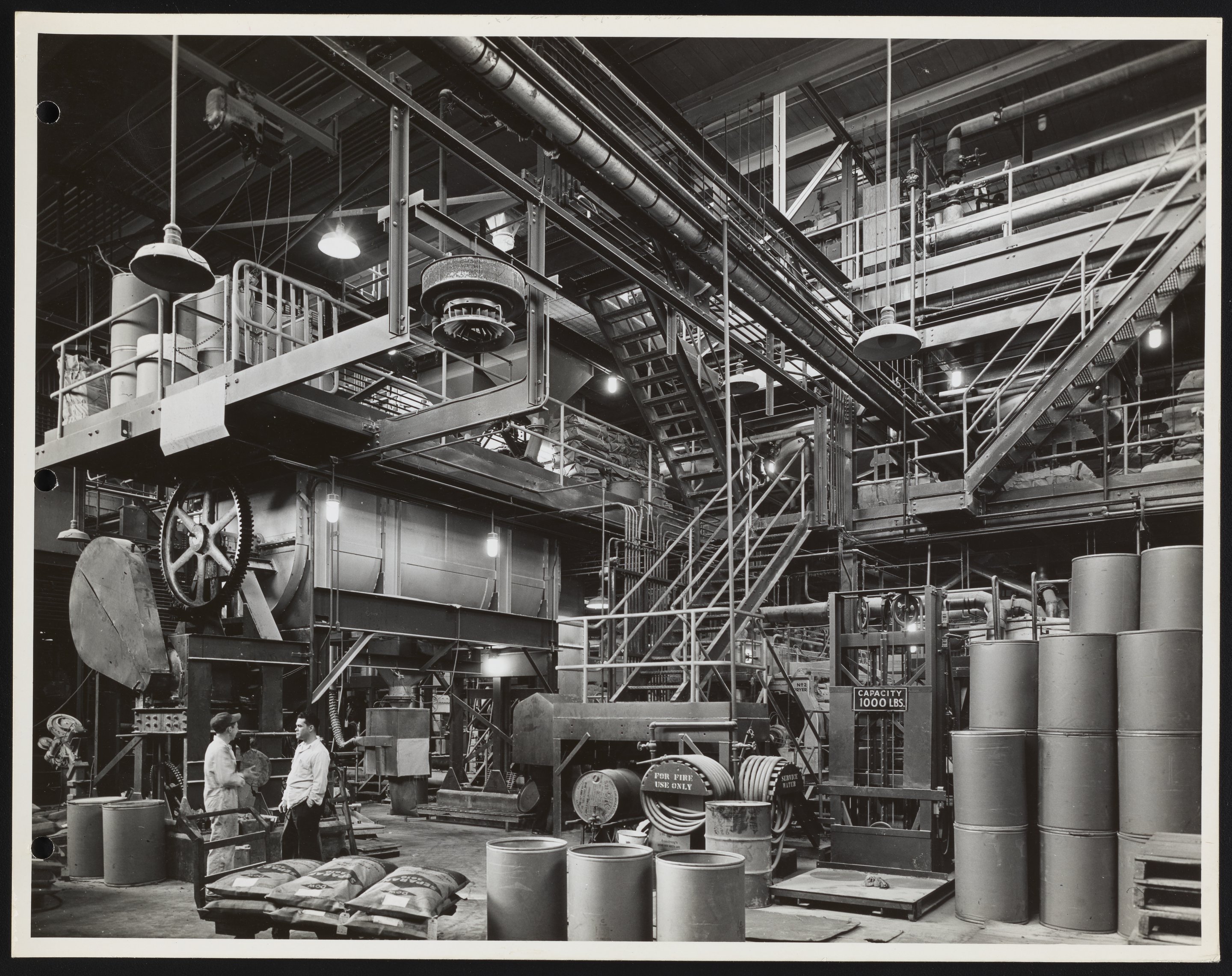 General view of the interior of the Dow Chemical Company's Separan plant located in Midland, Michigan. Separan was the trade name for water-soluble organic compounds sold as flocculating agents. In chemistry, flocculation is the process whereby colloids or other suspended particles in a liquid aggregate to form flakes, which subsequently either sink to the bottom or float to the surface of the liquid, and then can be removed or collected.