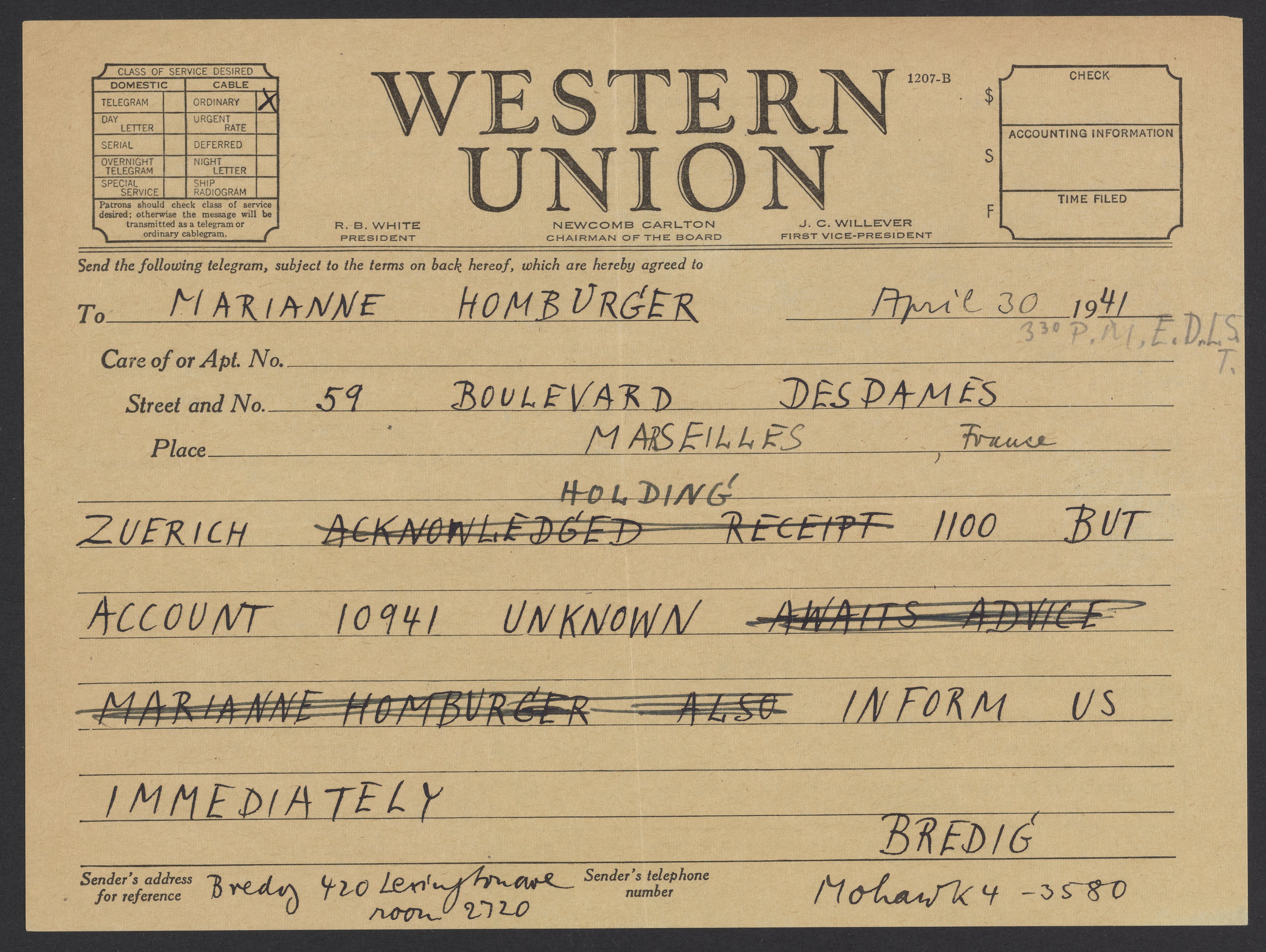 Telegram from Max Bredig to Marianne Homburger, April 30, 1941
