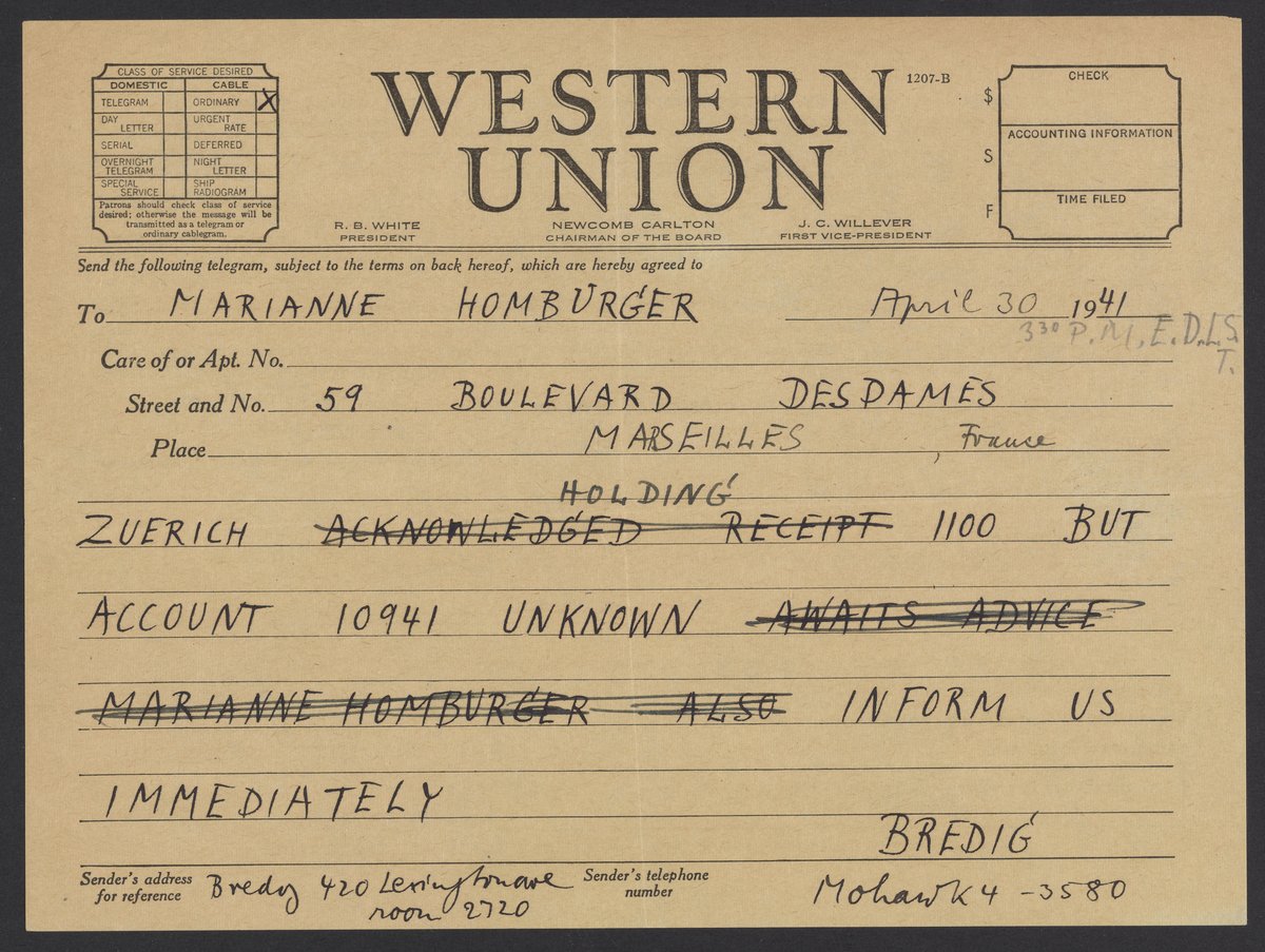 Telegram from Max Albert Bredig (1902-1977) to his sister Marianne Homburger (1902-1986) asking about account information for a money transfer.