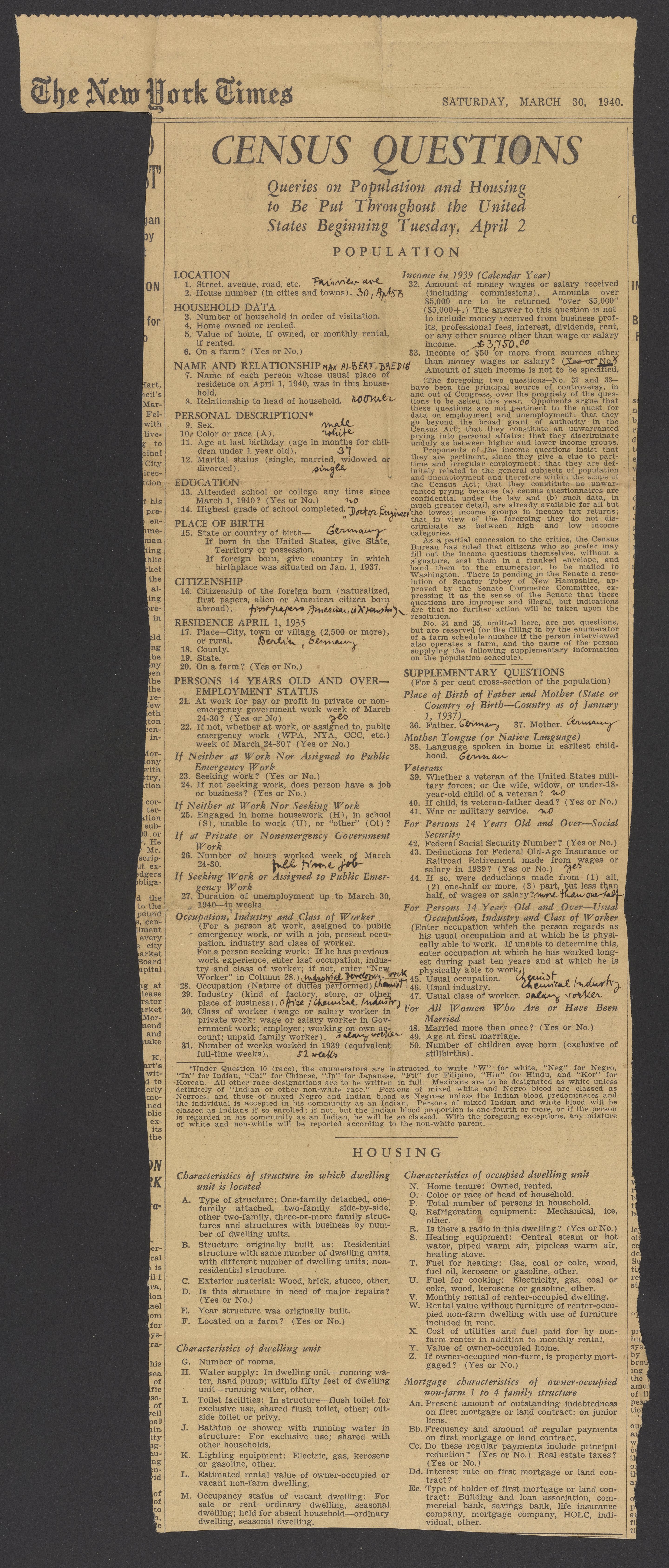 Article explaining questions that will be appearing in the census. Max Albert Bredig (1902-1977) has annotated the article with his own answers.