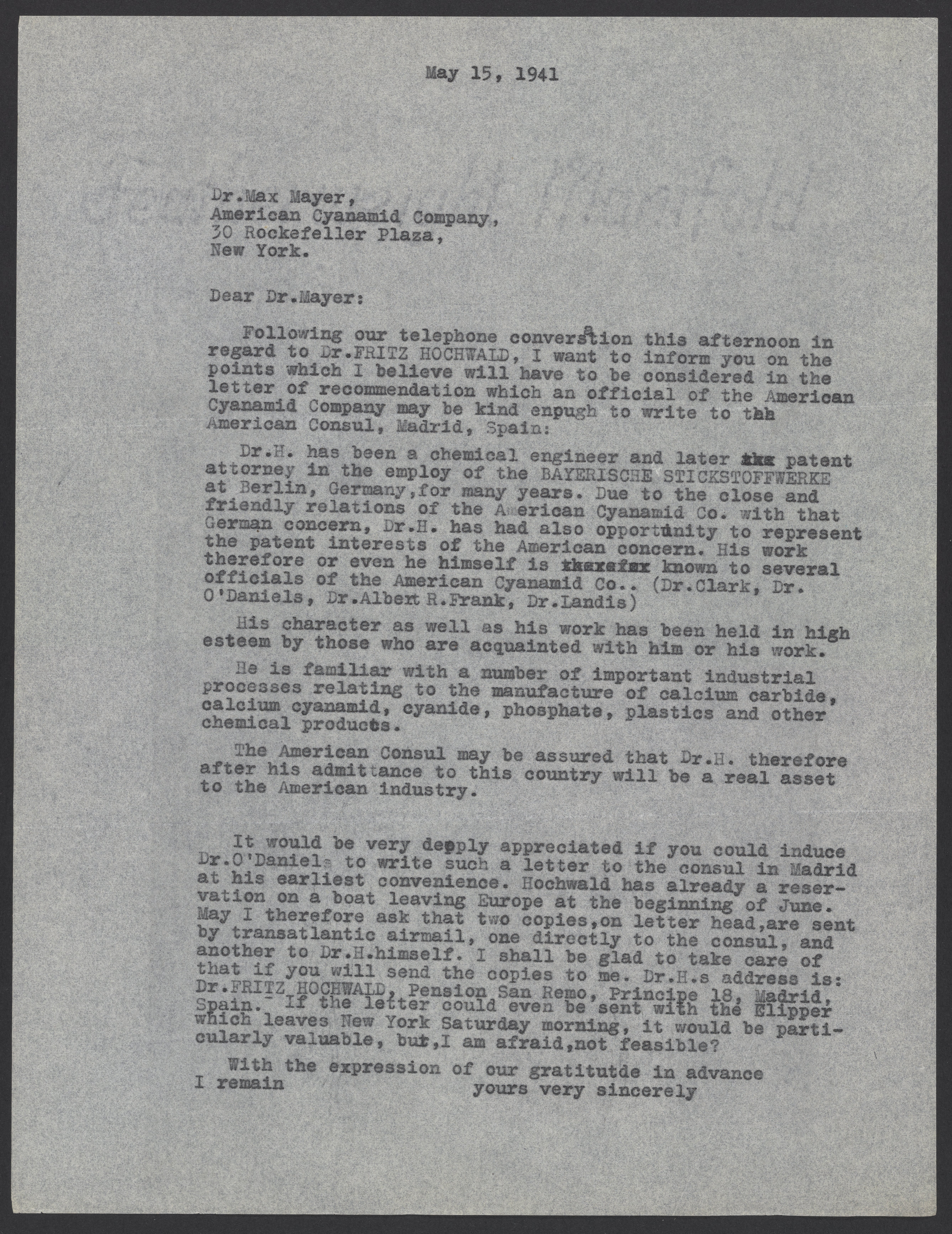 Letter from Max Bredig to Max Mayer, May 15, 1941