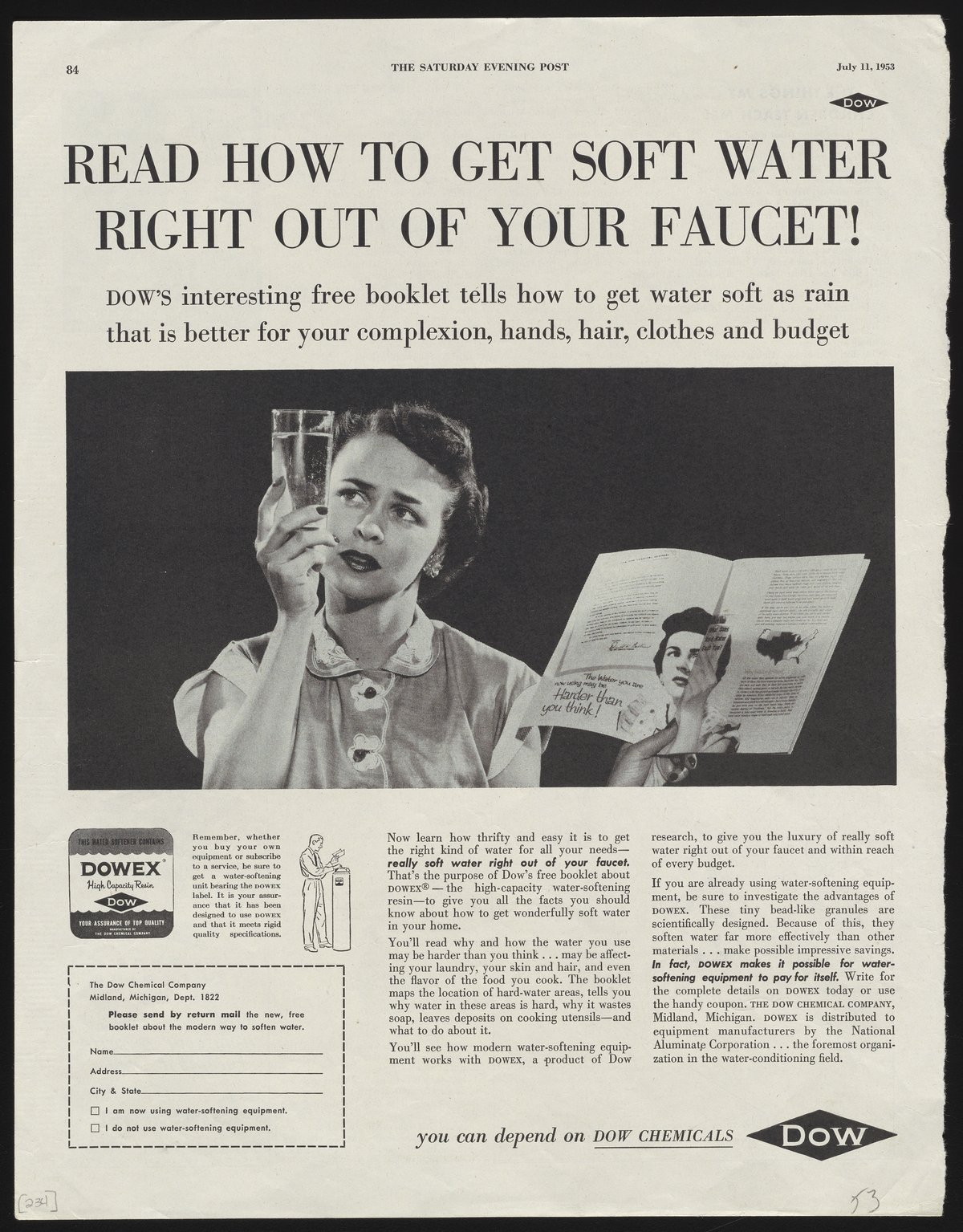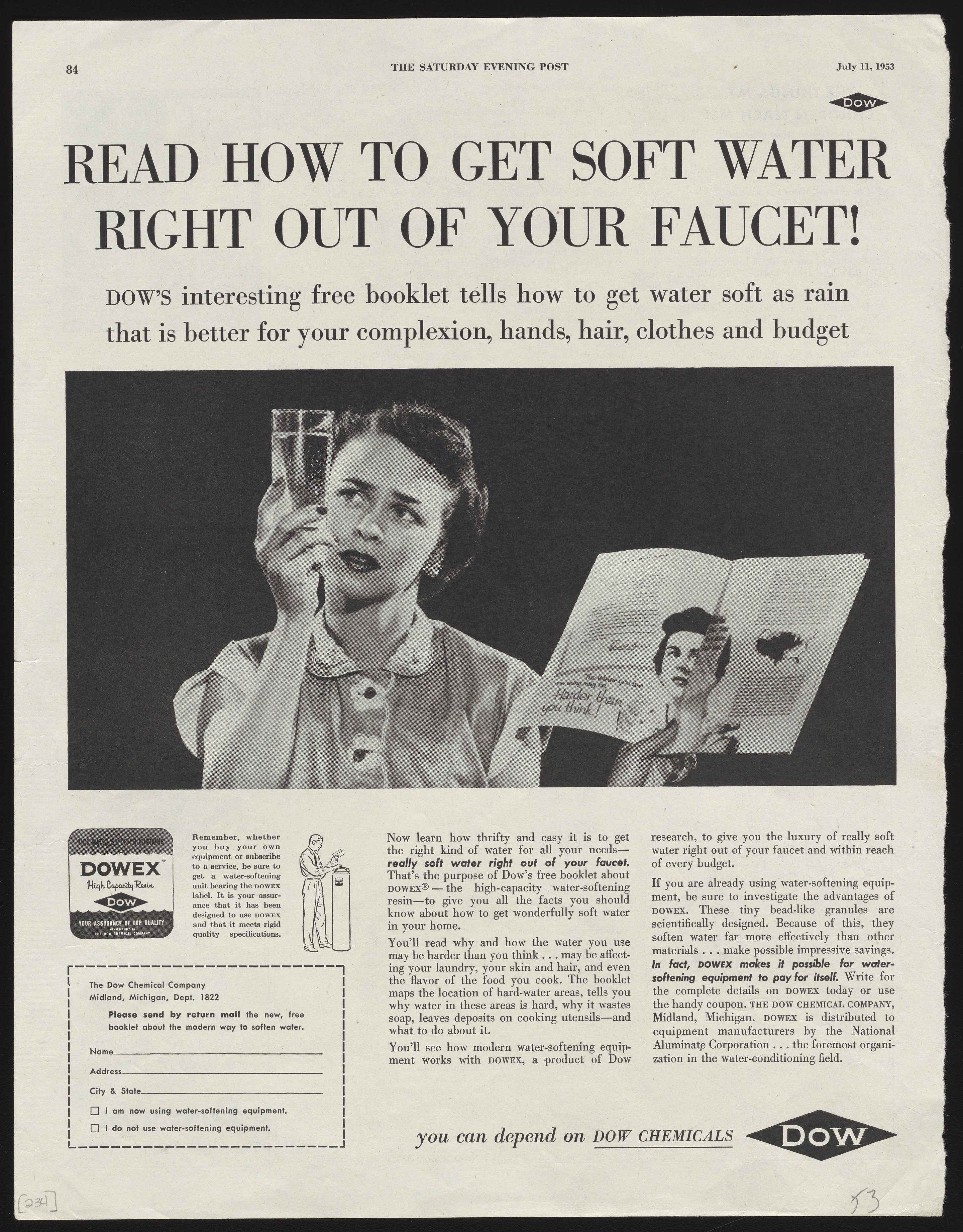 Dow Chemical Company. “Read How to Get Soft Water Right Out of Your Faucet!,” July 11, 1953. Advertisements from the Dow Chemical Historical Collection, Box 7. Science History Institute. Philadelphia. https://digital.sciencehistory.org/works/c247ds80n.