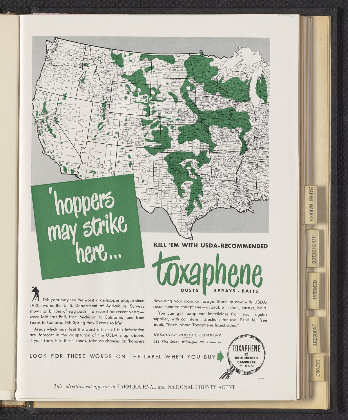 Hercules Incorporated. “'Hoppers May Strike Here...Kill 'Em with USDA-Recommended Toxaphene.” 1949 Hercules Advertisements, 1949. Records of Hercules Incorporated, Volume 1949. Science History Institute. Philadelphia. https://digital.sciencehistory.org/works/c247ds84r.