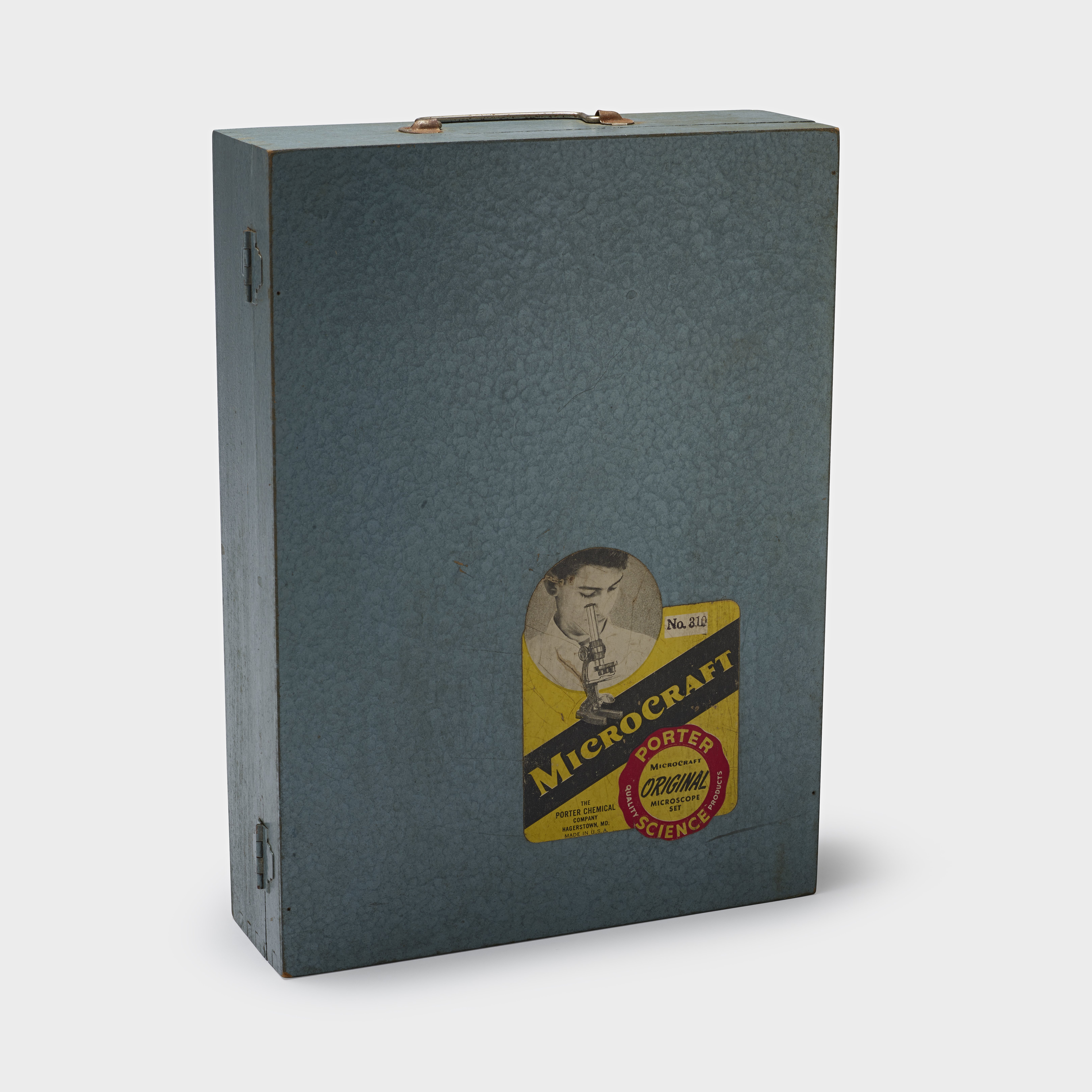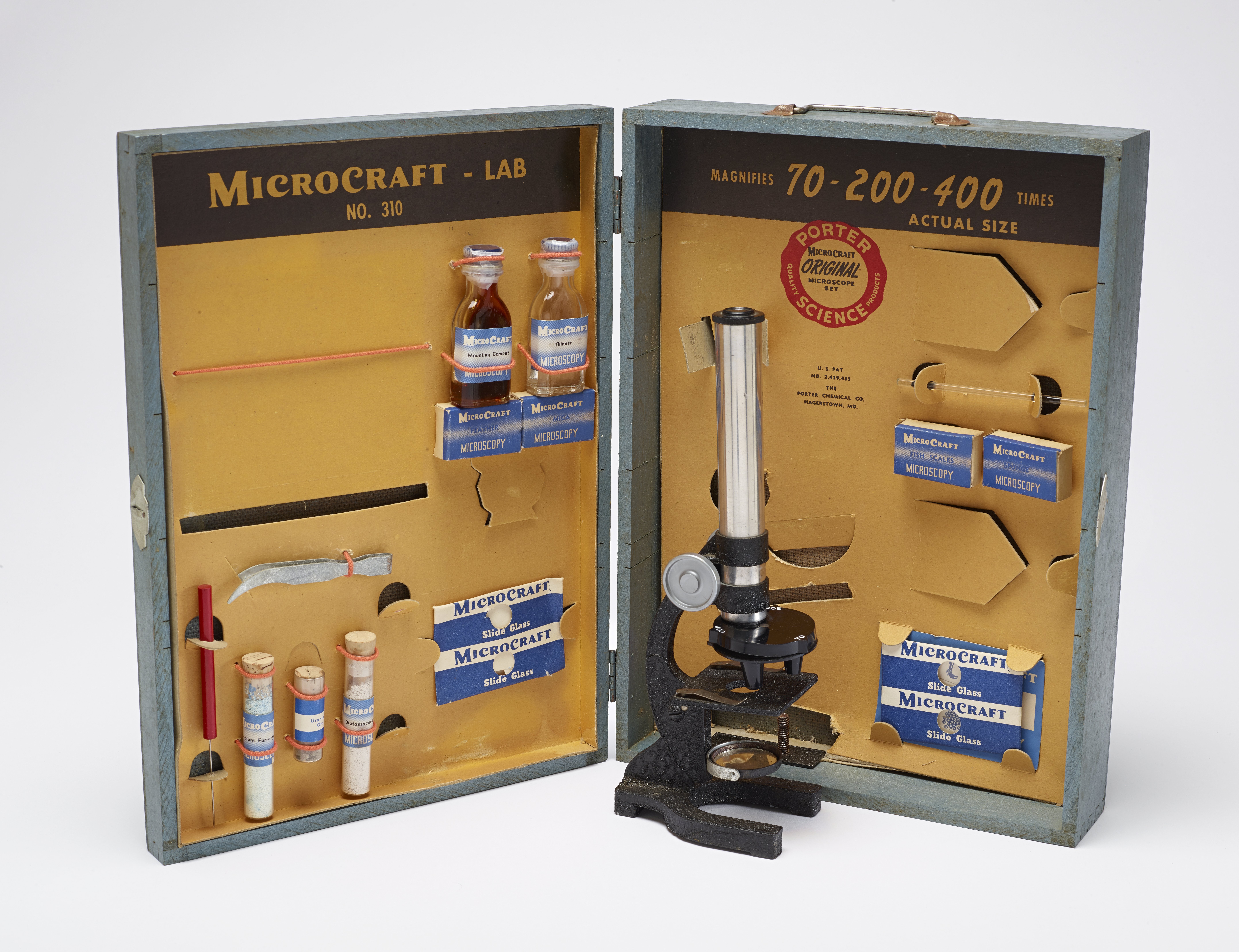 Small JPG1200 x 922px — 159 KBLarge JPG2880 x 2213px — 740 KBFull-sized JPG8621 x 6625px — 5.8 MBOriginal fileTIFF — 8621 x 6625px — 163 MBWooden grey-blue case that opens on a hinge. Inside, the left side of the case contains a sealed glass bottle of mounting cement, a sealed glass bottle of thinner, small cardboard boxes labeled "Microcraft Microscopy feather" and "Microcraft Microscopy mica", a pair of tweezers, a needle, three test tubes with cork stoppers one containing sodium ferrocyanide, one containing uranium ore, the last containing diatomaceous earth, and an empty paper packet labeled "Microcraft Slide Glass". The right side of the case contains a glass stirring rod, two boxes labeled "Microcraft Microscopy fish scales" and "Microcraft Microscopy sponge", one paper packet labeled "Microcraft Slide Glass" containing glass slides, one paper packet labeled "Microcraft Microscopy Slide Labels" containing paper labels, and a microscope. Set includes manual, microscope instructions, and an inspection information card.