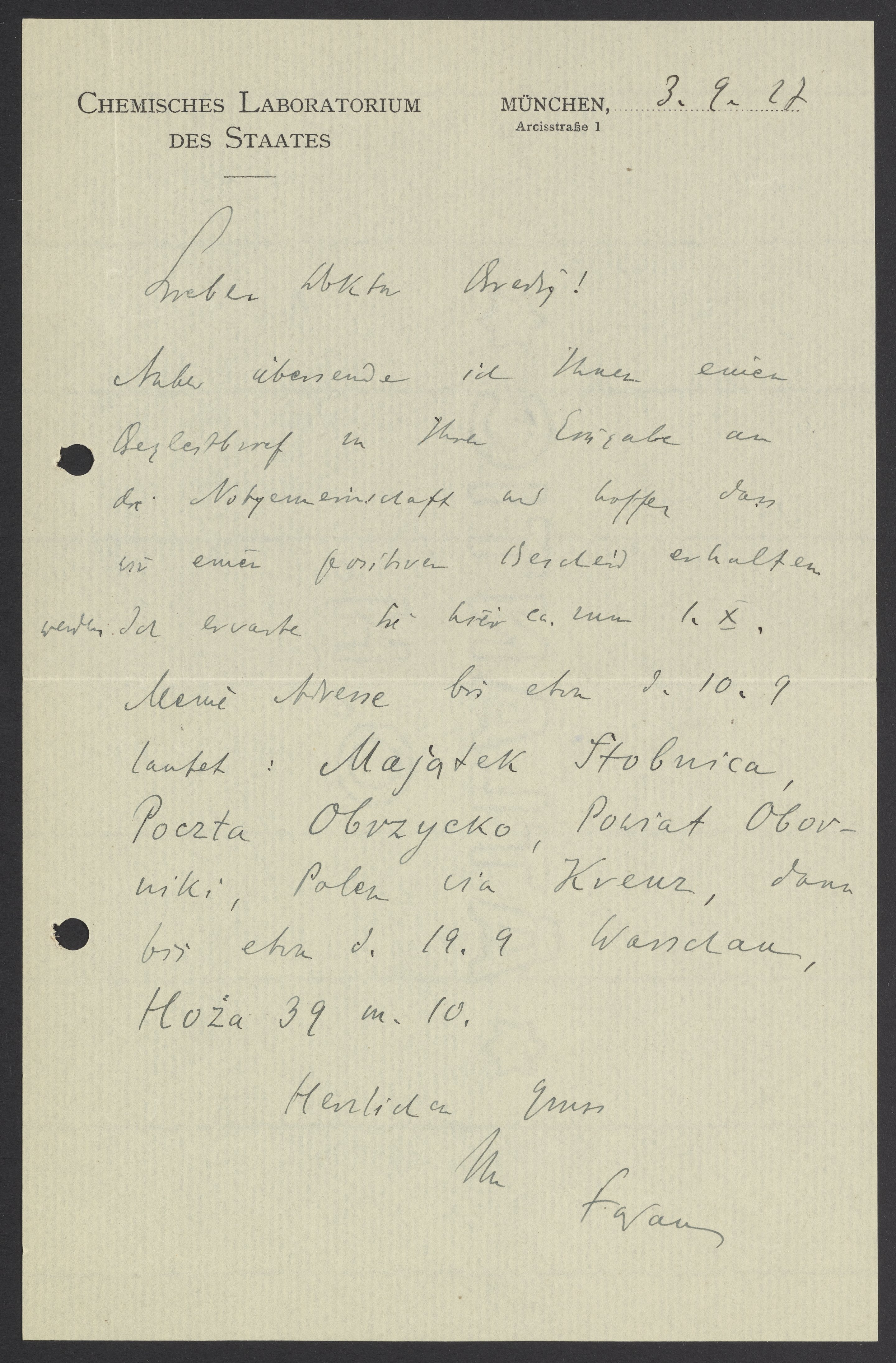 Heute übersende ich Ihnen einen Begleitbrief zu Ihrer Eingabe an die Notgemeinschaft und hoffe dass Sie einen positiven Bescheid erhalten werden. Ich erwarte Sie hier ca. zum 1. X. Meine Adresse bis etwa d. 10.9 lautet: Majatek Stolnica, Poczta Obvzycko, Powiat Oblovwiki, Polen via Kreuz, dann bis etwa d. 19.9 Warschau, Hoza 39 m. 19.