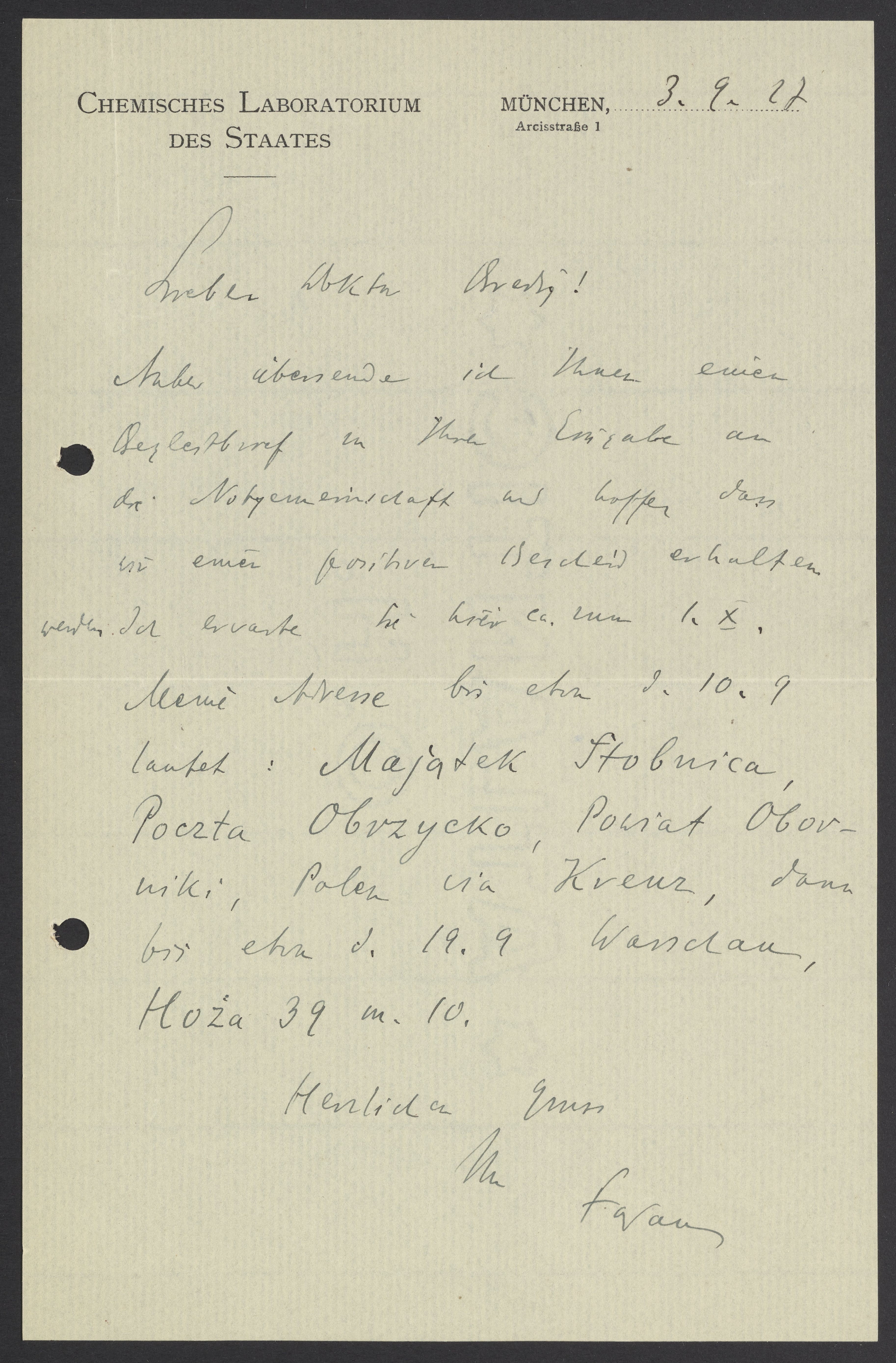 Heute übersende ich Ihnen einen Begleitbrief zu Ihrer Eingabe an die Notgemeinschaft und hoffe dass Sie einen positiven Bescheid erhalten werden. Ich erwarte Sie hier ca. zum 1. X. Meine Adresse bis etwa d. 10.9 lautet: Majatek Stolnica, Poczta Obvzycko, Powiat Oblovwiki, Polen via Kreuz, dann bis etwa d. 19.9 Warschau, Hoza 39 m. 19.