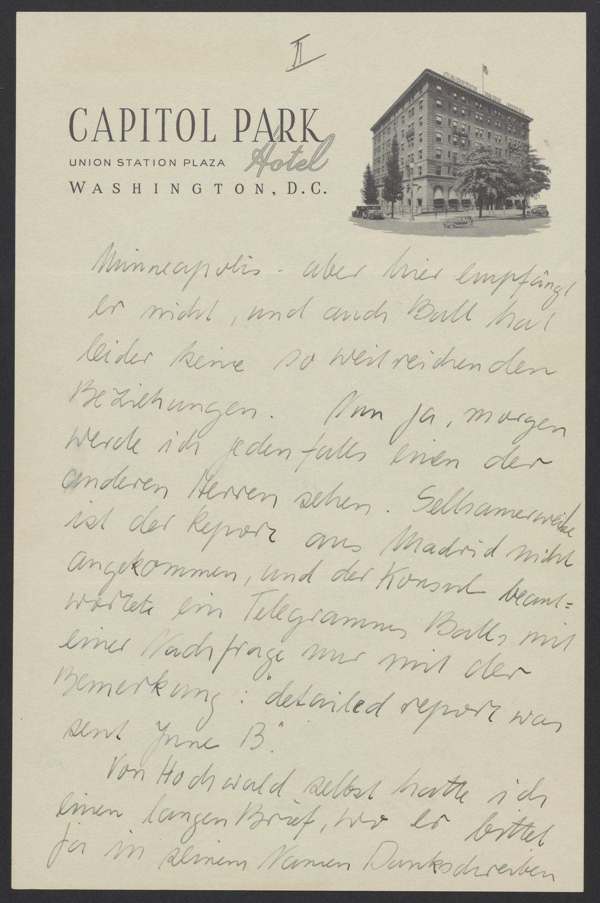 nun bin ich doch noch in Washington gelandet, um zu versuchen von hier aus in letzter Minute etwas zu tun – ob wir Erfolg (haben) ?! – Ich weiss es nicht. Heute hatte man auf dem State Dept. Hochwalds „Files“ verlegt und konnte sie trotz ernsthafter Bemühungen nicht wieder finden. Erst am Abend wurde ich benachrichtigt, dass sie sich in einem Office gefunden hätten.