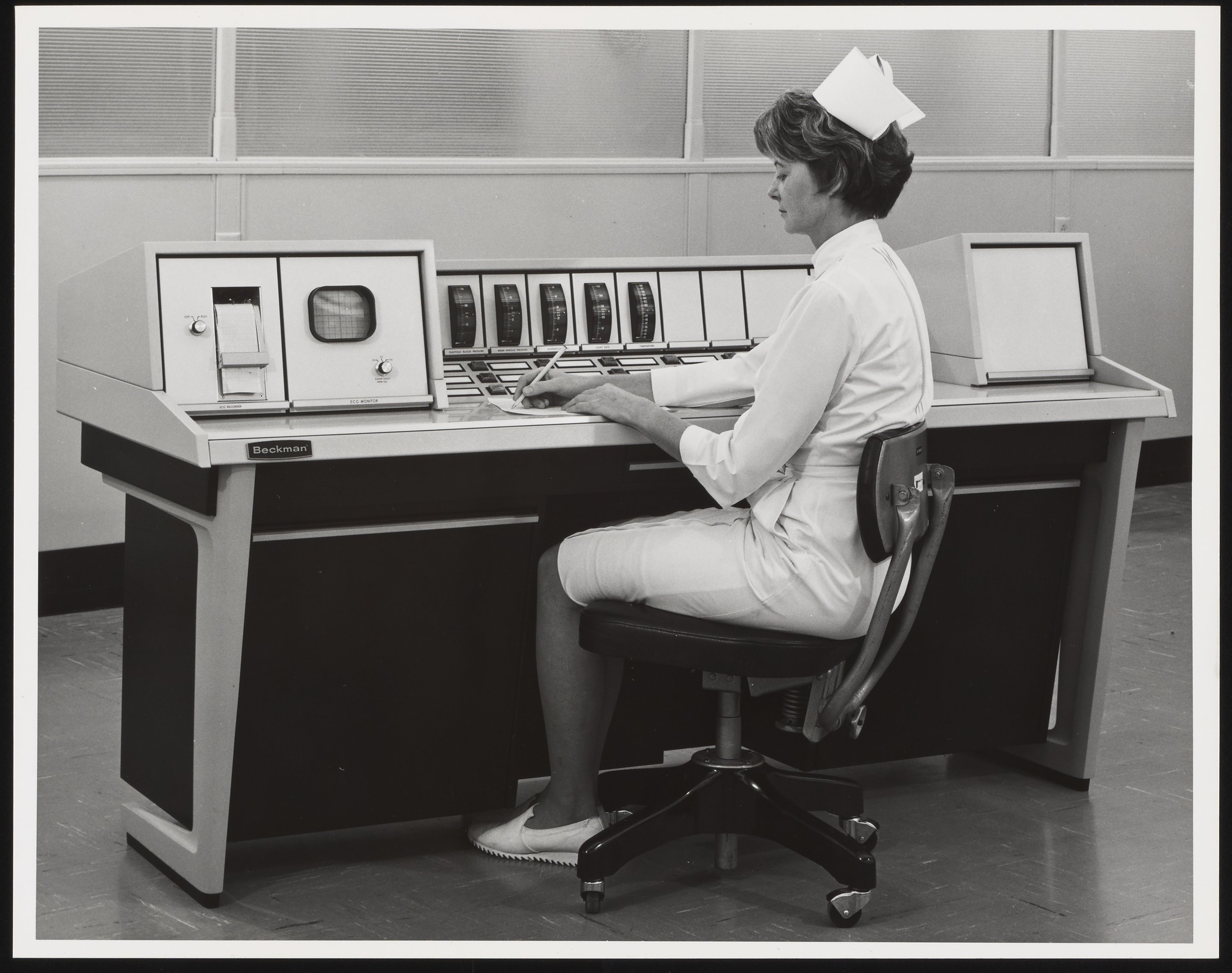 “Nurse Seated at Beckman Monitoring Station,” n.d. Beckman Historical Collection, Box 82. Science History Institute. Philadelphia. https://digital.sciencehistory.org/works/c534fp15k.