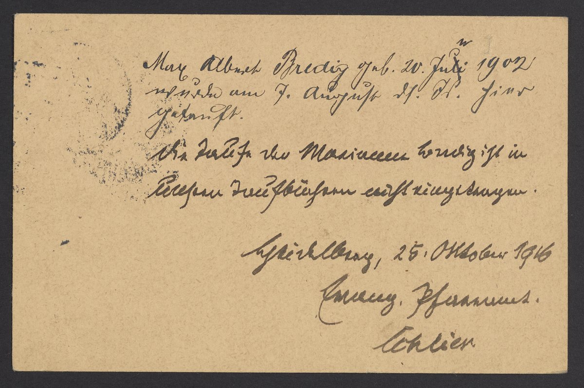 Letter to Rosa Bredig regarding the baptism of Max Bredig, October 25, 1916
