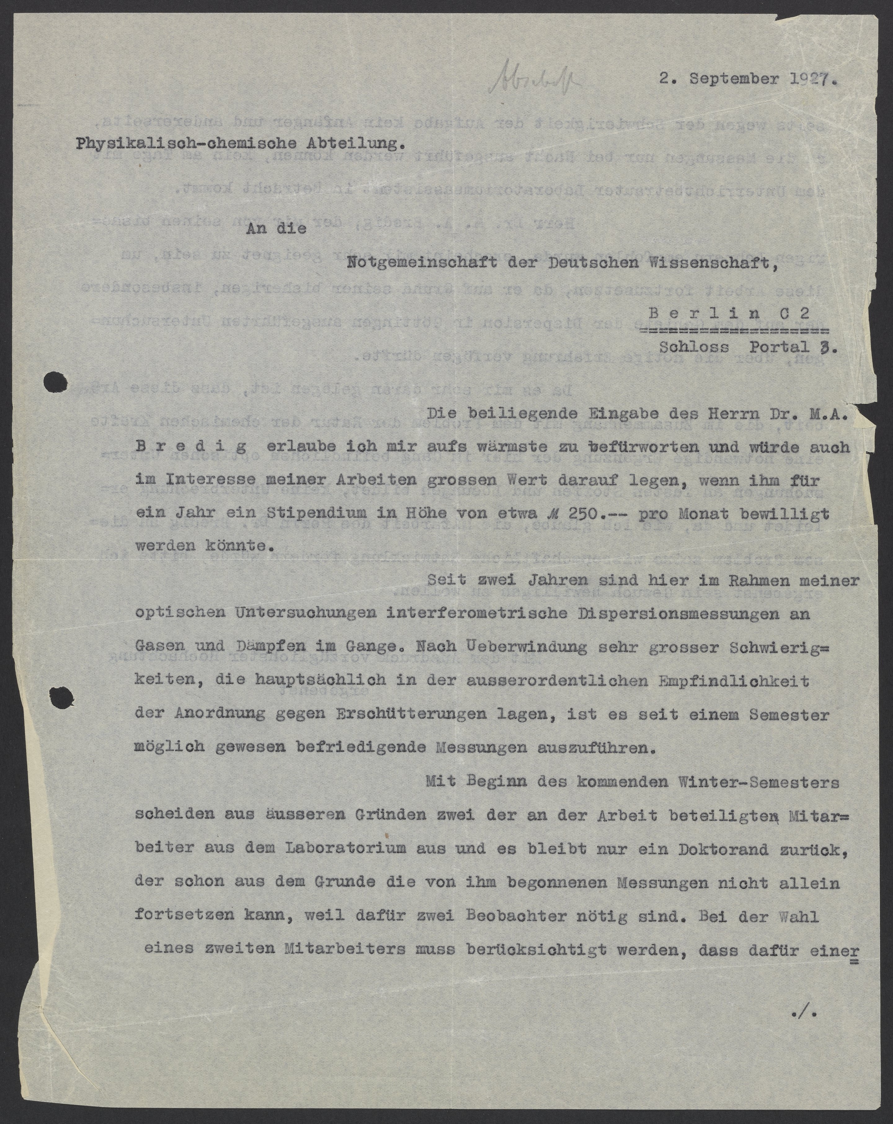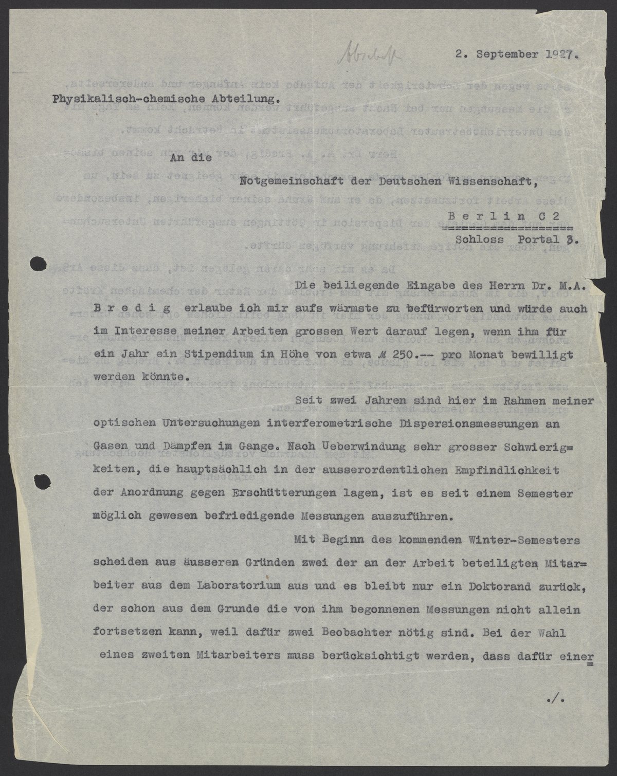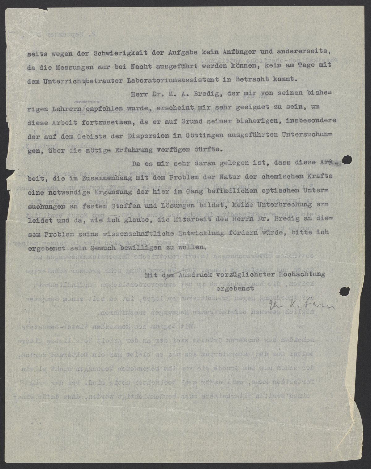 Recommendation Letter from Kasimir Fajans for Max Bredig, September 2, 1927