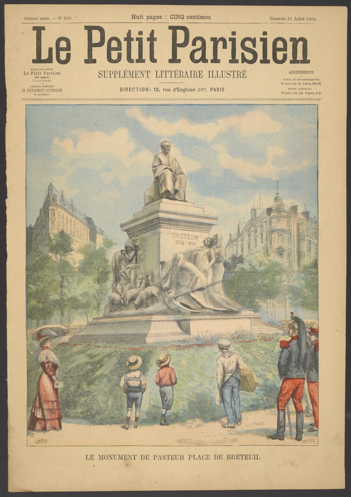 Front cover illustration for the French newspaper, Le Petit Parisien (published between 1876 and 1944). The illustration features the statue of Louis Pasteur that stands in the center of Le Place de Breteuil in Paris. The statue of Pasteur was built in 1904 by sculptor Alexandre Falguière.