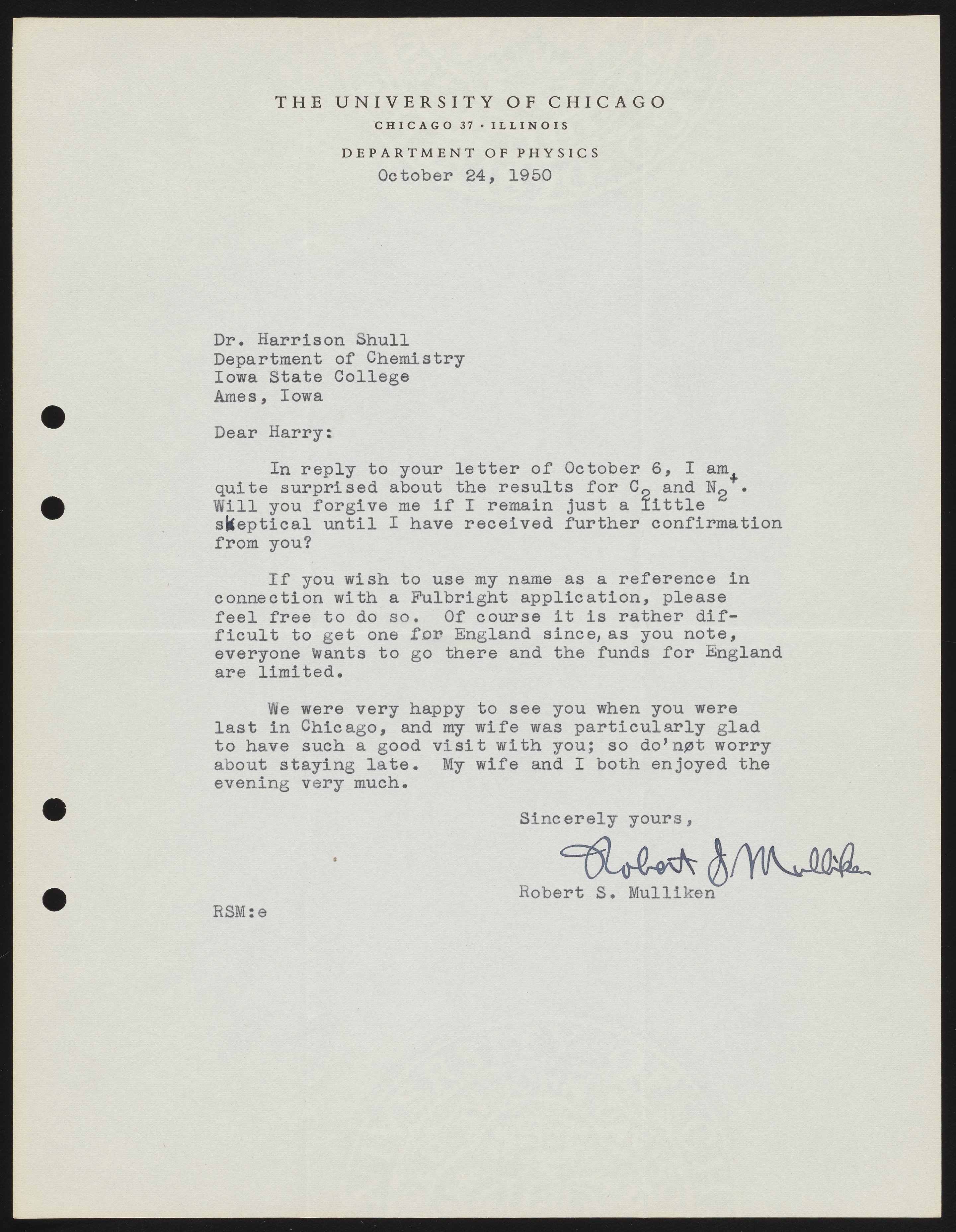 Letter from Robert S. Mulliken to Harrison Shull, 1950
