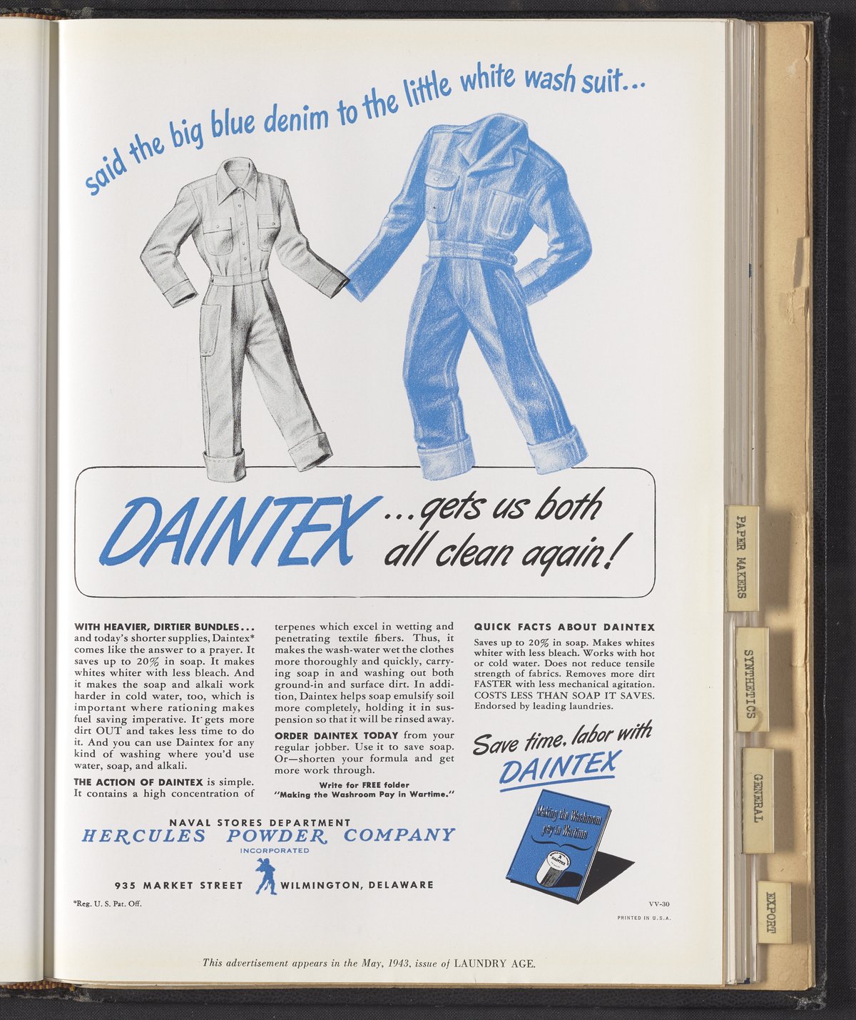 Hercules Incorporated. “Said the Big Blue Denim to the Little White Wash Suit...” 1943 Hercules Advertisements, 1943. Records of Hercules Incorporated, Volume 1943. Science History Institute. Philadelphia. https://digital.sciencehistory.org/works/c821gk626.