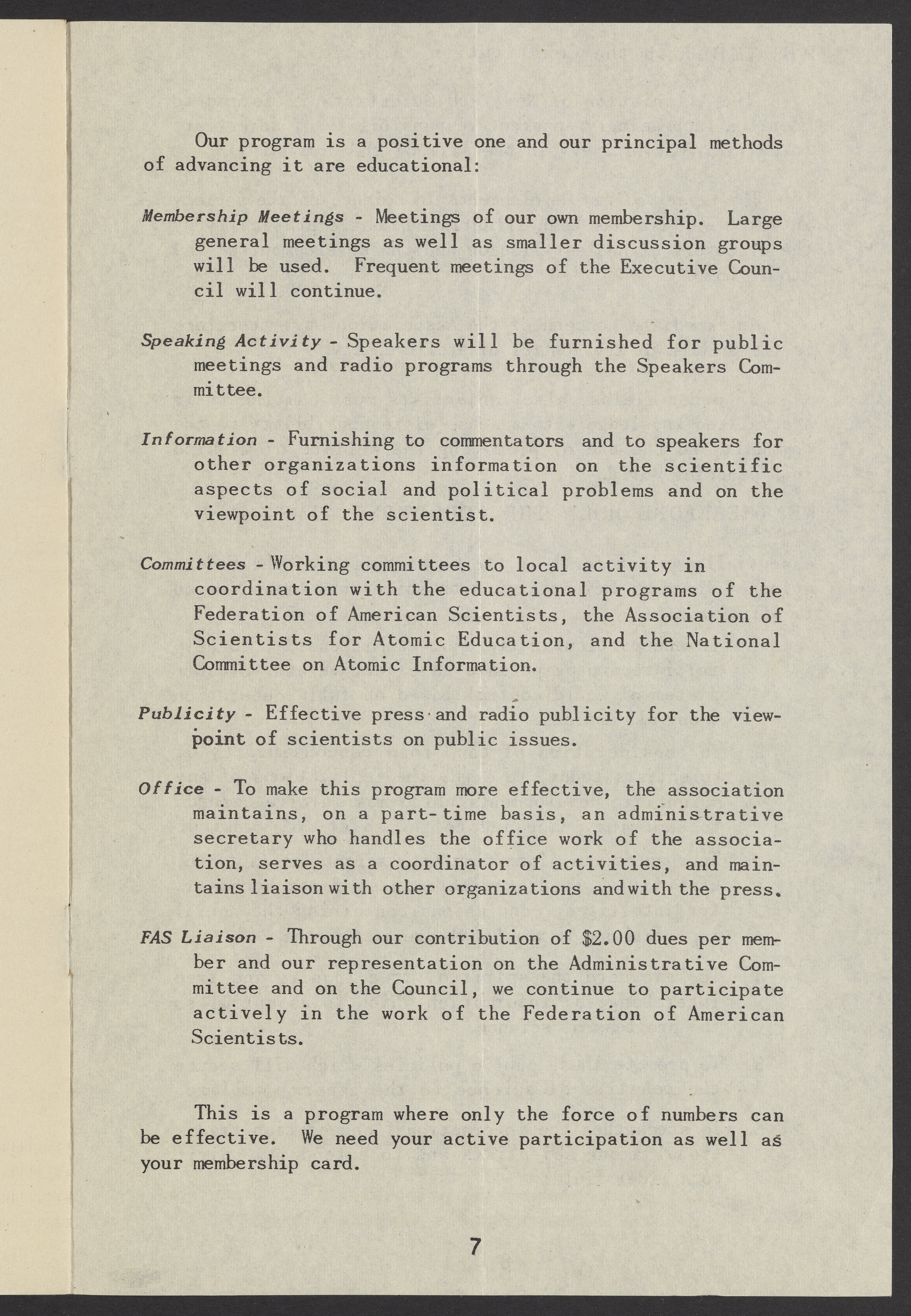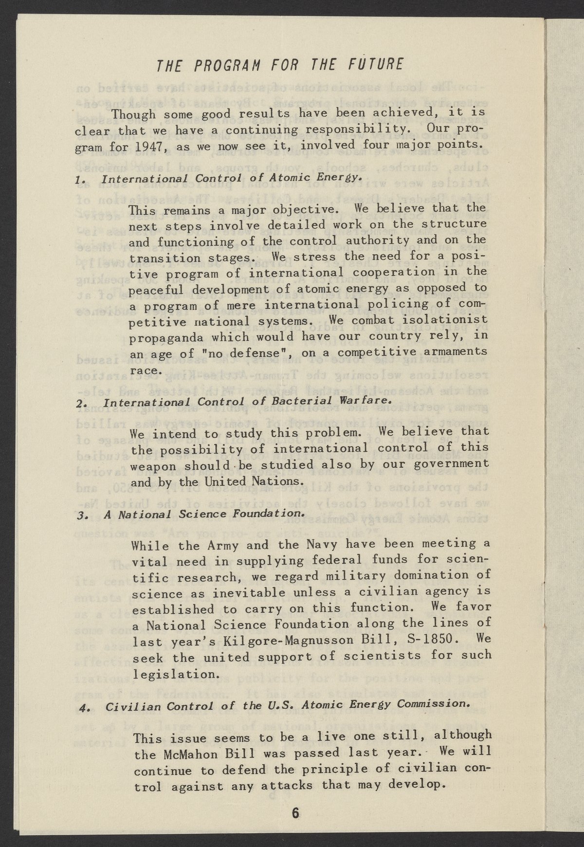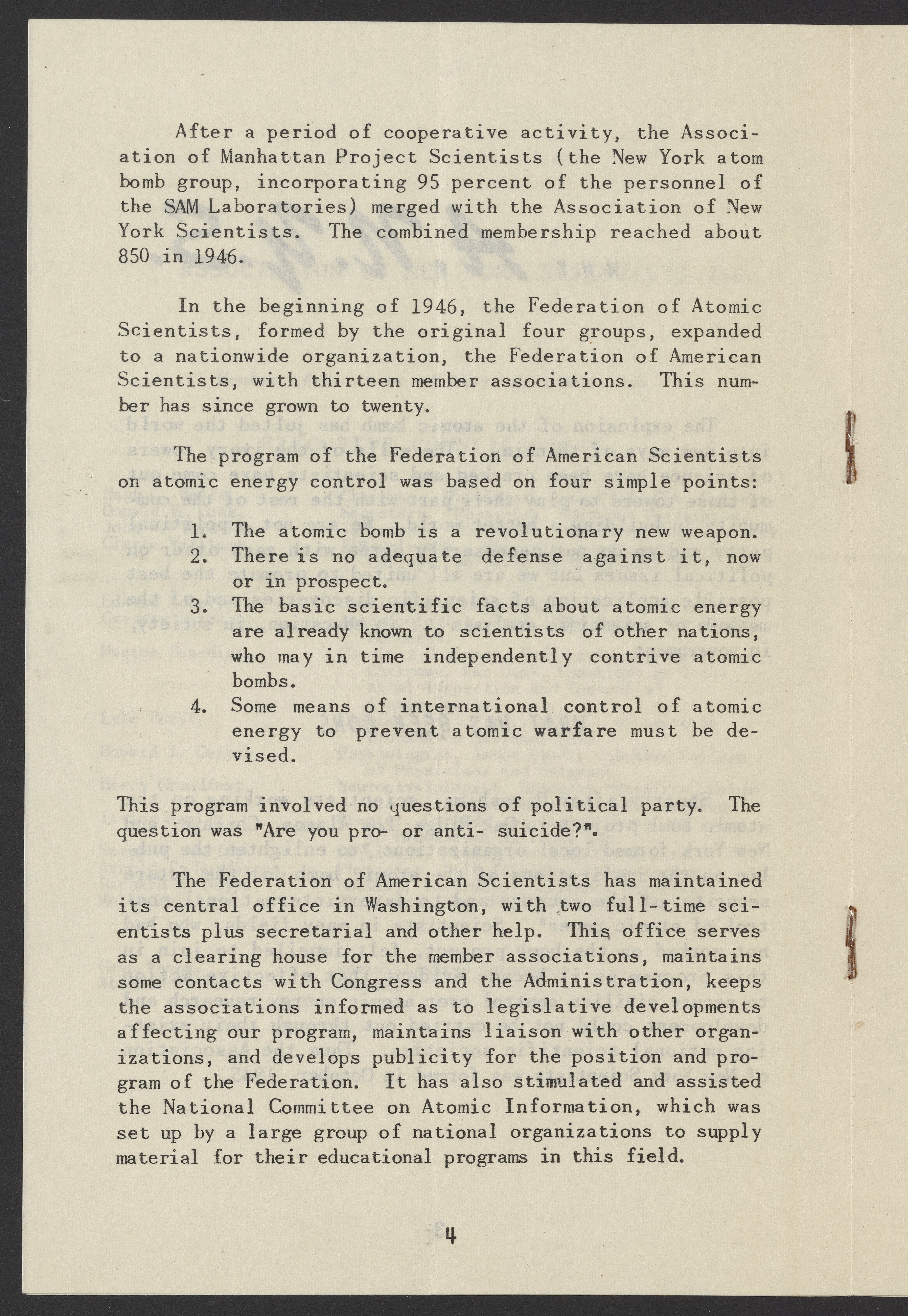 Small JPG1200 x 1825px — 280 KBLarge JPG2880 x 4380px — 1.7 MBFull-sized JPG3543 x 5388px — 2.5 MBOriginal fileTIFF — 3543 x 5388px — 54.7 MB1947 newsletter for the Association of New York Scientists (ANYS). The newsletter discusses the association's purpose and goals. ANYS believed in international control of atomic energy and bacterial warfare, a national science foundation, and civilian control of the United States Atomic Energy Commission.