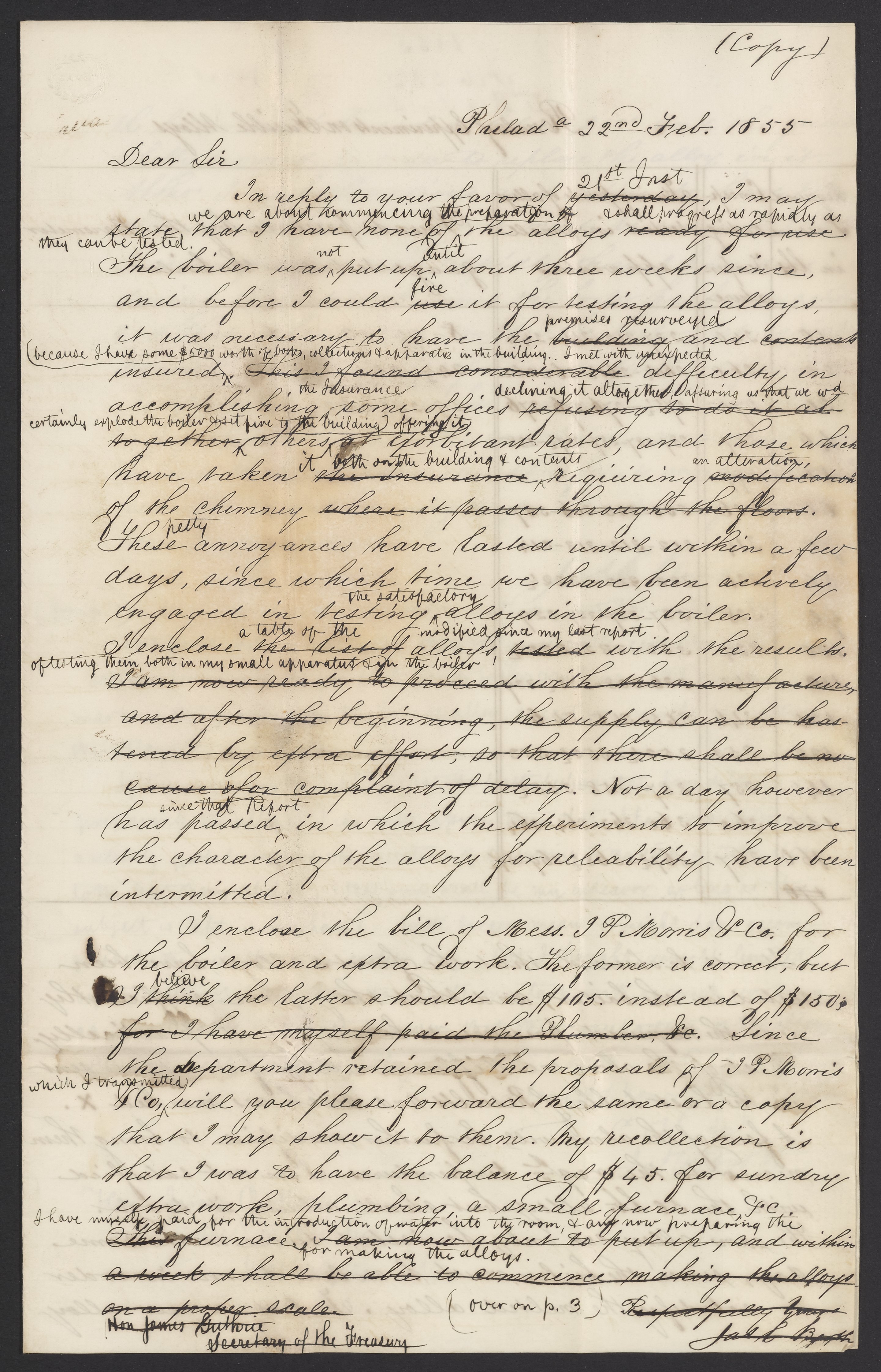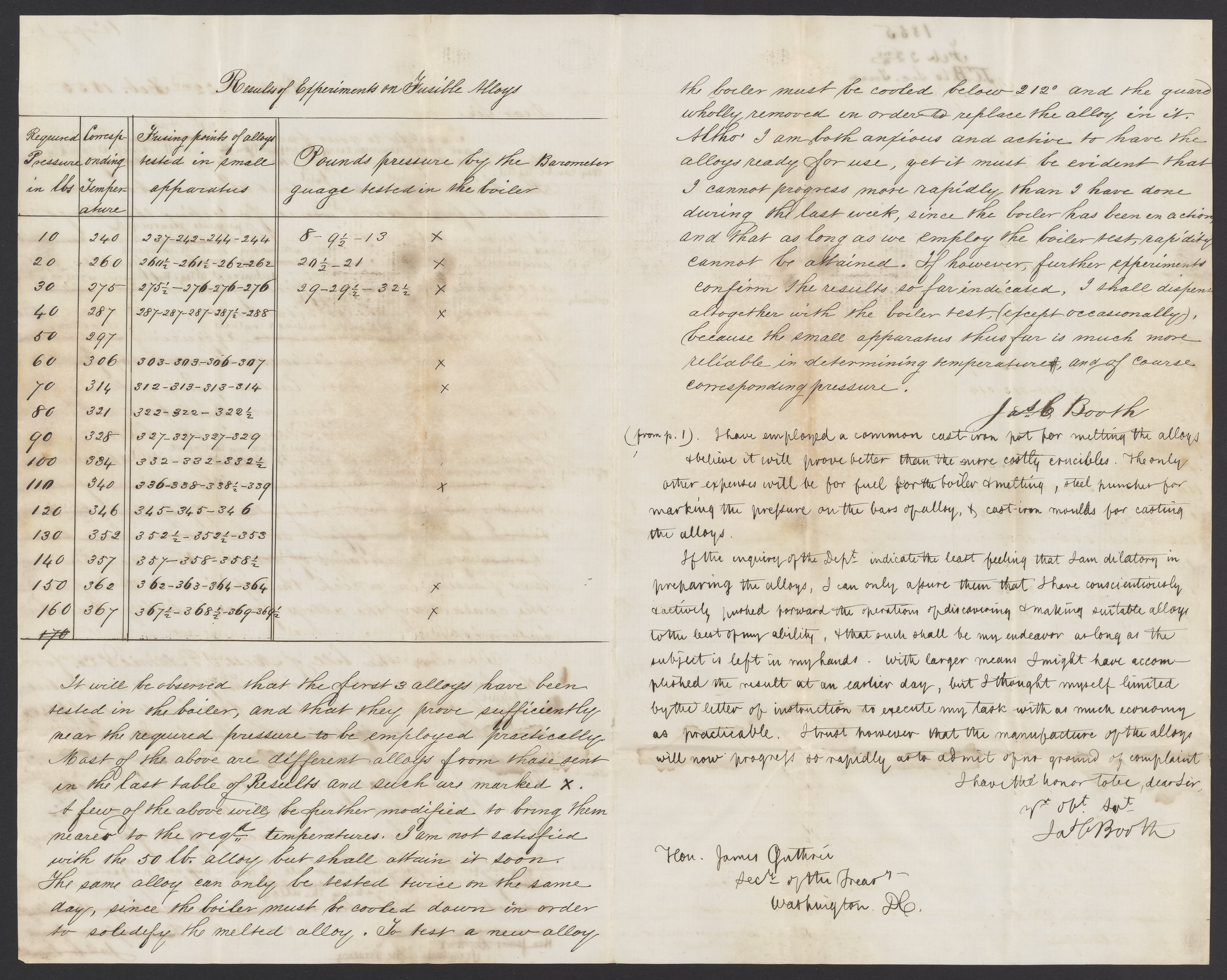 Small JPG1200 x 1868px — 505 KBLarge JPG2880 x 4484px — 2.0 MBFull-sized JPG3361 x 5233px — 2.5 MBOriginal fileTIFF — 3361 x 5233px — 50.4 MBJames Curtis Booth (1810-1888), melter and refiner of the United States Mint, writes to James Guthrie (1794-1869), Secretary of the Treasury, to discuss his experiments with alloys. Booth includes a table of his results.
