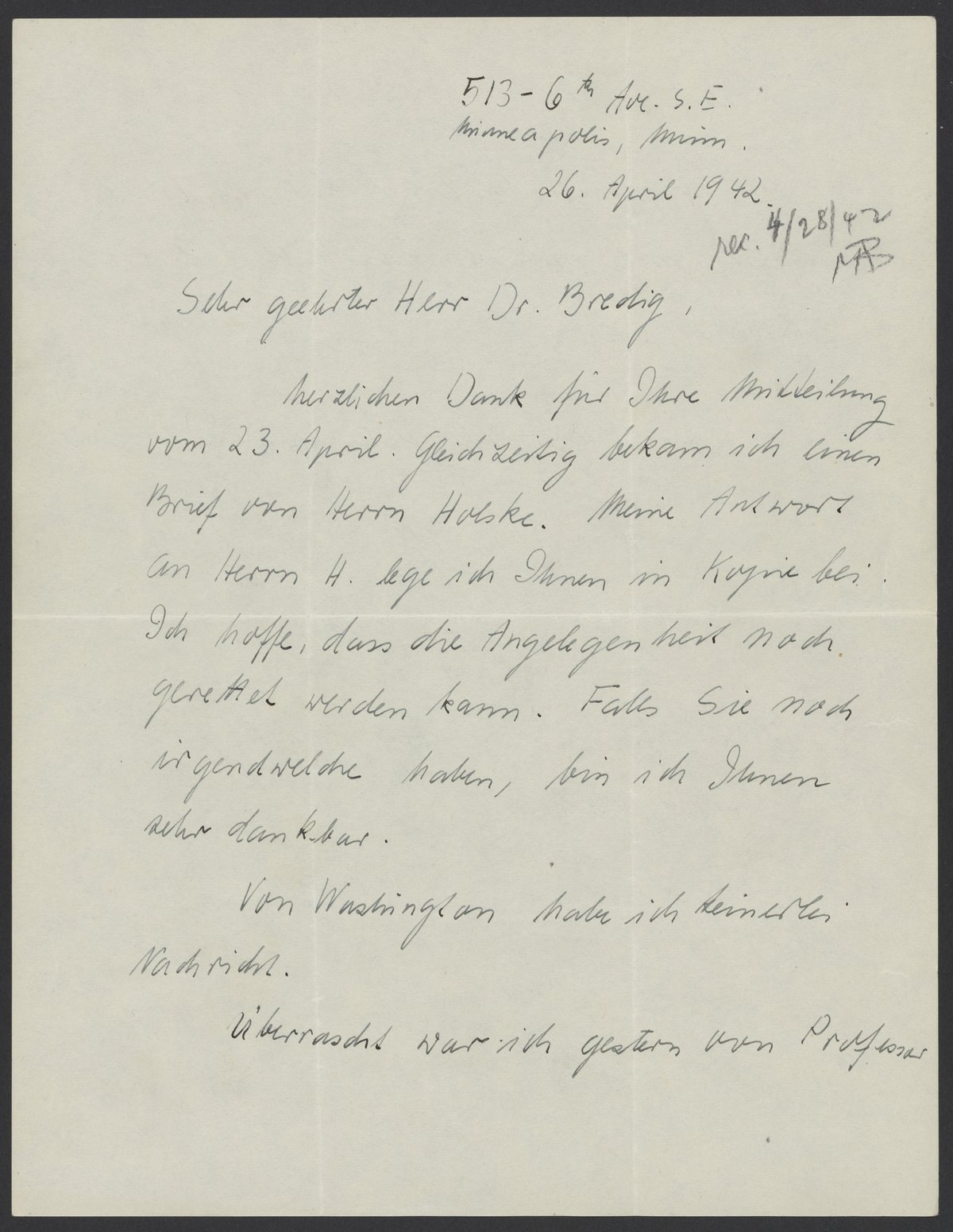 [Max Bredig’s hand: rec. 4/28/42 MAB]