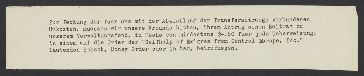 Zur Deckung der fuer uns mit der Abwickung der Transferantraege verbundenen Unkosten, muessen wir unsere Freunde bitten, ihrem Antrag einen Beitrag zu unserem Verwaltungsfond, in Hoehe von mindestens $-.50 fuer jede Ueberweisung, in einem auf die Order der "Selfhelp of Emigres from Central Europe Inc." lautenden Scheck, Money Order oder in bar, beizufuegen.