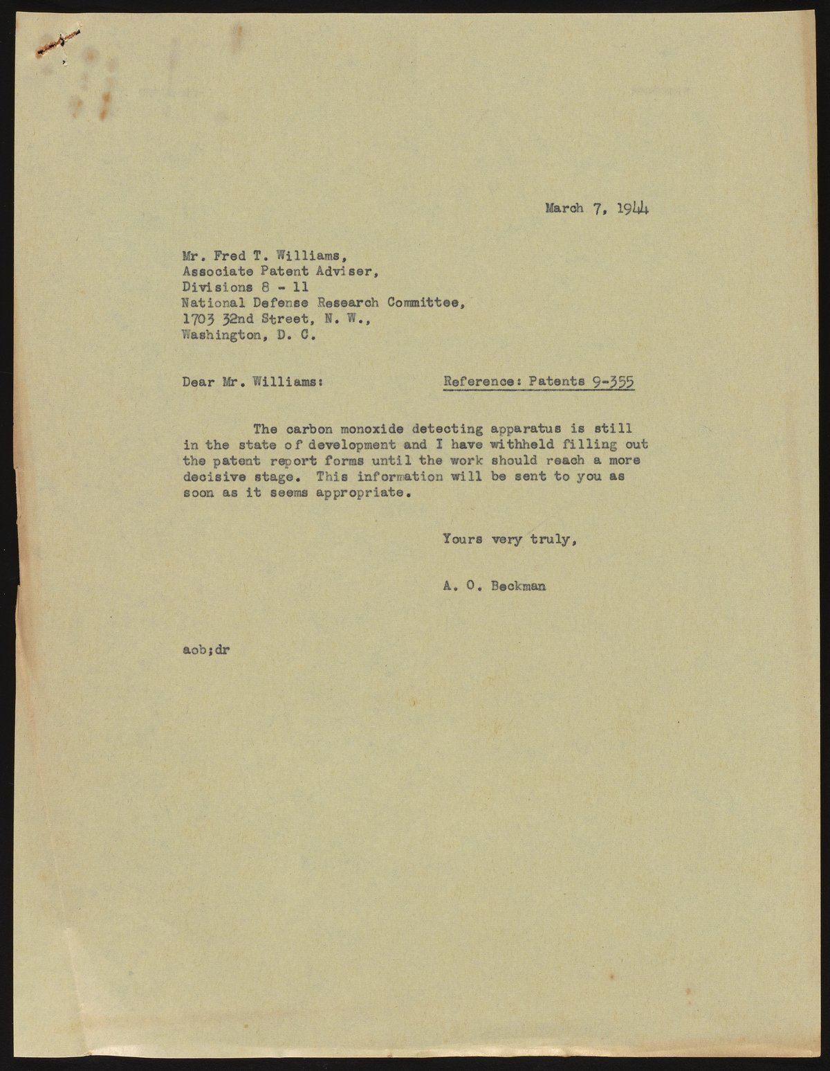 A letter from Arnold O. Beckman to Fred T. Williams, a patent advisor at the National Defense Research Committee. In this letter, Beckman reports on the delay in filing a patent for his carbon monoxide detecting "apparatus." This instrument would eventually become an important part of Beckman's fight against air pollution.