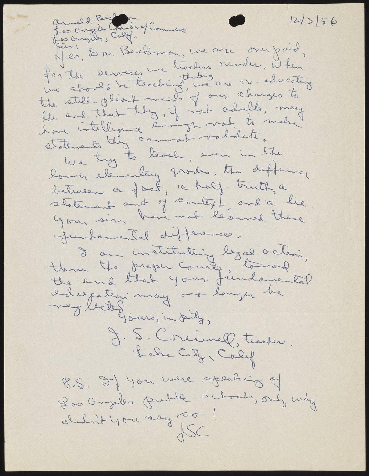 This is one of many letters written to Arnold Beckman in response to his comments on the topic of education. In this handwritten letter, J. S. Criswell identifies as a teacher and threatens legal action against Beckman, who has “not learned these fundamental differences” between facts, half-truths, statements, and lies.