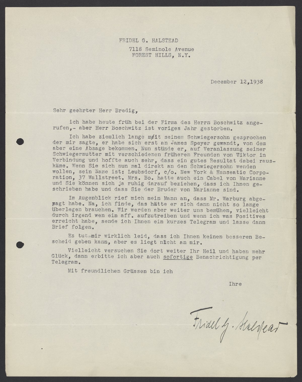 Letter from Fridel G. Halstead to Max Bredig, December 12, 1938