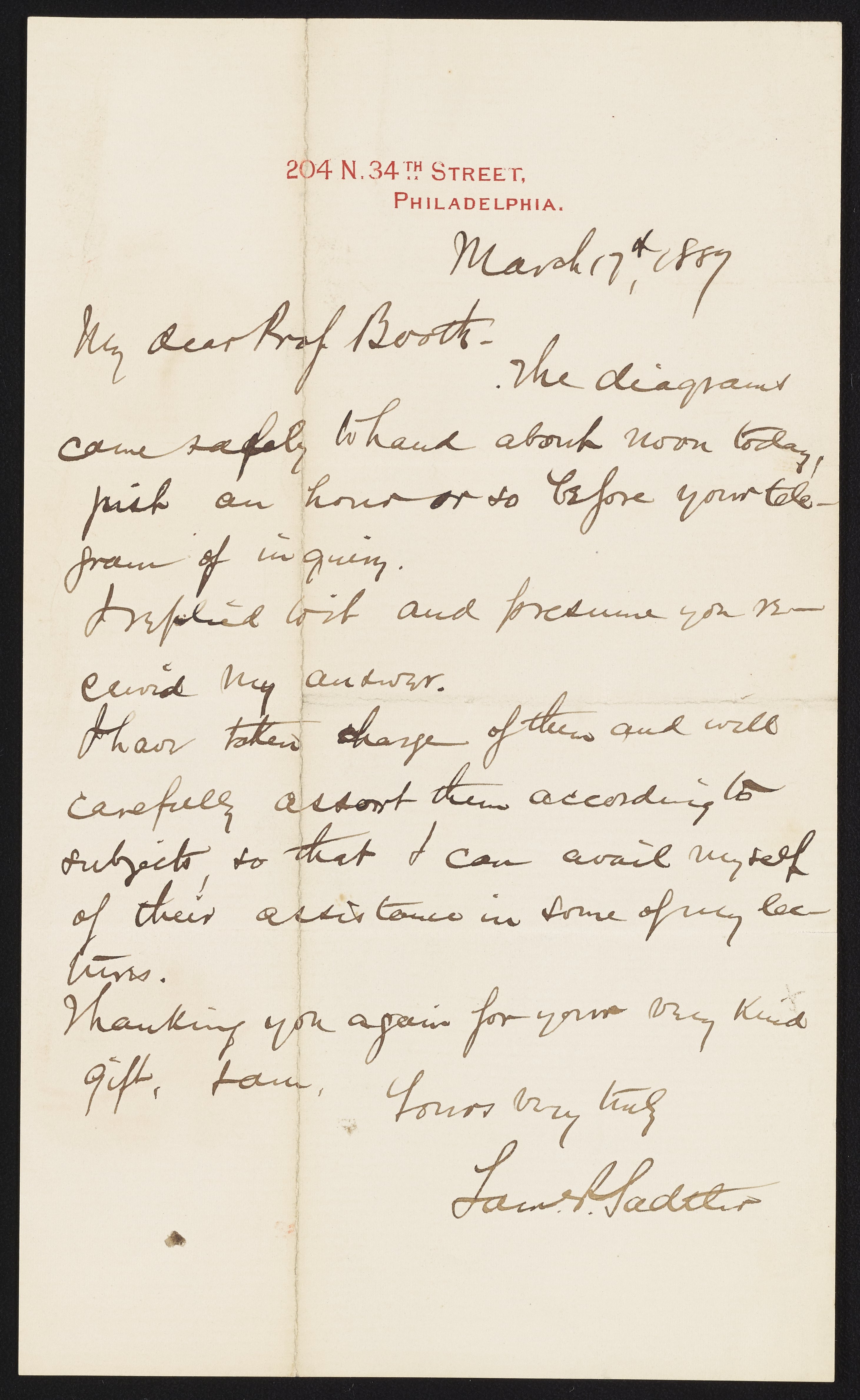 Lawrence Sadtler writes to James Curtis Booth (1810-1888) to confirm that he has received diagrams sent by Booth.