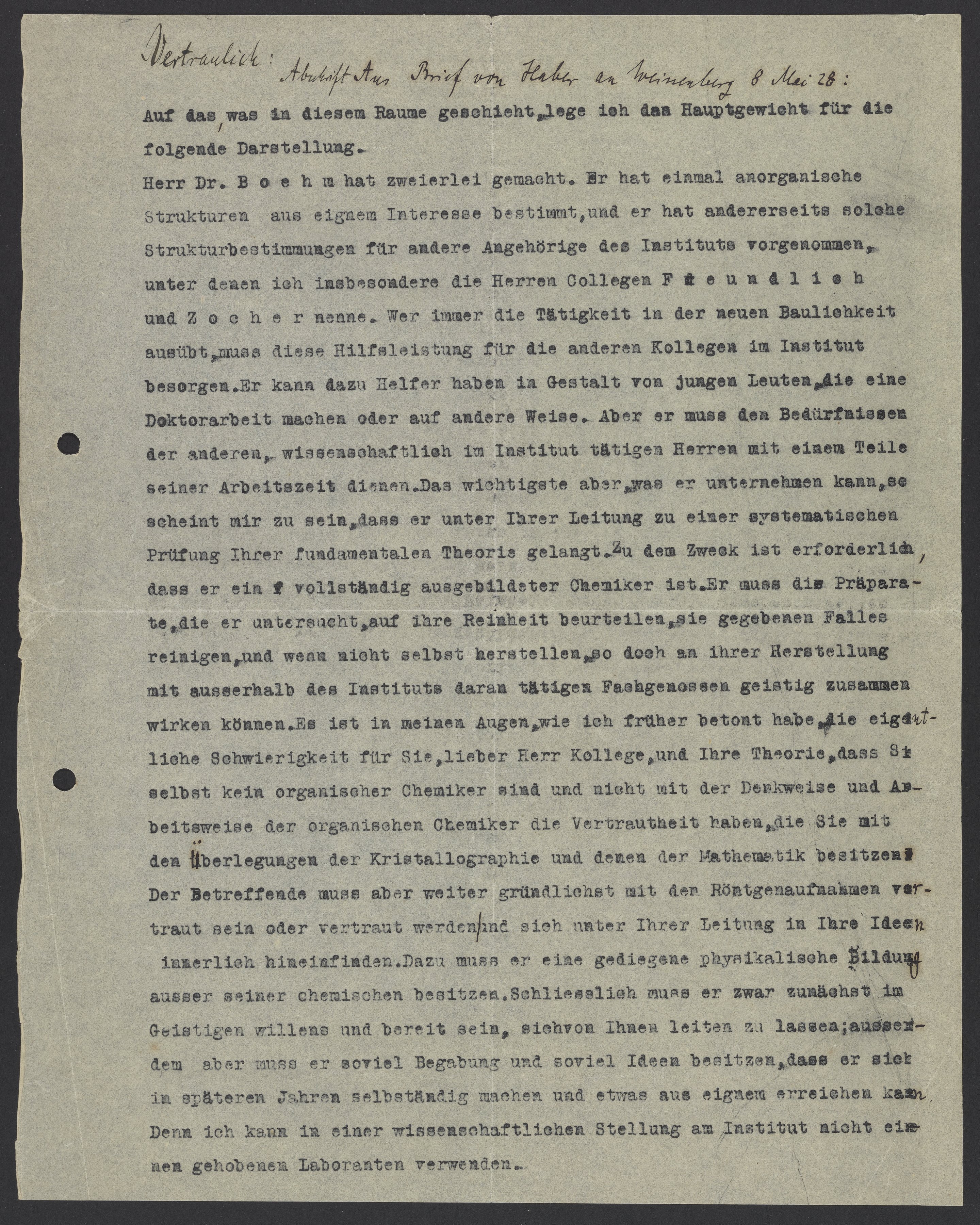 Herr Dr. Boehm hat zweierlei gemacht. Er hat einmal anorganische Strukturen aus eignem Interesse bestimmt, und er hat andererseits solche Strukturbestimmungen für andere Angehörige des Instituts vorgenommen, unter denen ich insbesondere die Herren Collegen Freundlich und Zocher nenne. Wer immer die Tätigkeit in der neuen Baulichkeit ausübt, muss diese Hilfsleistung für die anderen Kollegen im Institut besorgen. Er kann dazu Helfer haben in Gestalt von jungen Leuten, die eine Doktorarbeit machen oder auf andere Weise. Aber er muss den Bedürfnissen der anderen, wissenschaftlich im Institut tätigen Herren mit einem Teile seiner Arbeitszeit dienen. Das wichtigste aber was er unternehmen kann, so scheint mir zu sein, dass er unter Ihrer Leitung zu einer systematischen Prüfung Ihrer fundamentalen Theorie gelangt. Zu dem Zweck ist erforderlich, dass er ein vollständig ausgebildeter Chemiker ist. Er muss die Präparate, die er untersucht, auf ihre Reinheit beurteile, sie gegebenen Falles reinigen, und wenn nicht selbst herstellen, so doch an ihrer Herstellung mit ausserhalb des Instituts daran tätigen Fachgenossen geistig zusammen wirken können. Es ist in meinen Augen, wie ich früher betont habe, die eigentliche Schwierigkeit für Sie, lieber Herr Kollege, und Ihre Theorie, dass Sie selbst kein organischer Chemiker sind und nicht mit der Denkweise und Arbeitsweise der organischen Chemiker die Vertrautheit haben, die Sie mit den Überlegungen der Kristallographie und denen der Mathematik besitzen. Der Betreffende muss aber weiter gründlichst mit der Röntgenaufnahmen vertraut sein oder vertraut werden und sich unter Ihrer Leitung ich Ihre Ideen innerlich hineinfinden. Dazu muss er eine gediegene physikalische Bildung ausser seiner chemischen besitzen. Schliesslich muss er zwar zunächst im Geistigen willens und bereit sein, sich von Ihnen leiten zu lassen; ausserdem aber muss er soviel Begabung und soviel Ideen besitzen, dass er sich in späteren Jahren selbstständig machen und etwas aus eignem erreichen kann. Denn ich kann in einer wissenschaftlichen Stellung am Institut nicht einen gehobenen Laboranten verwenden.
