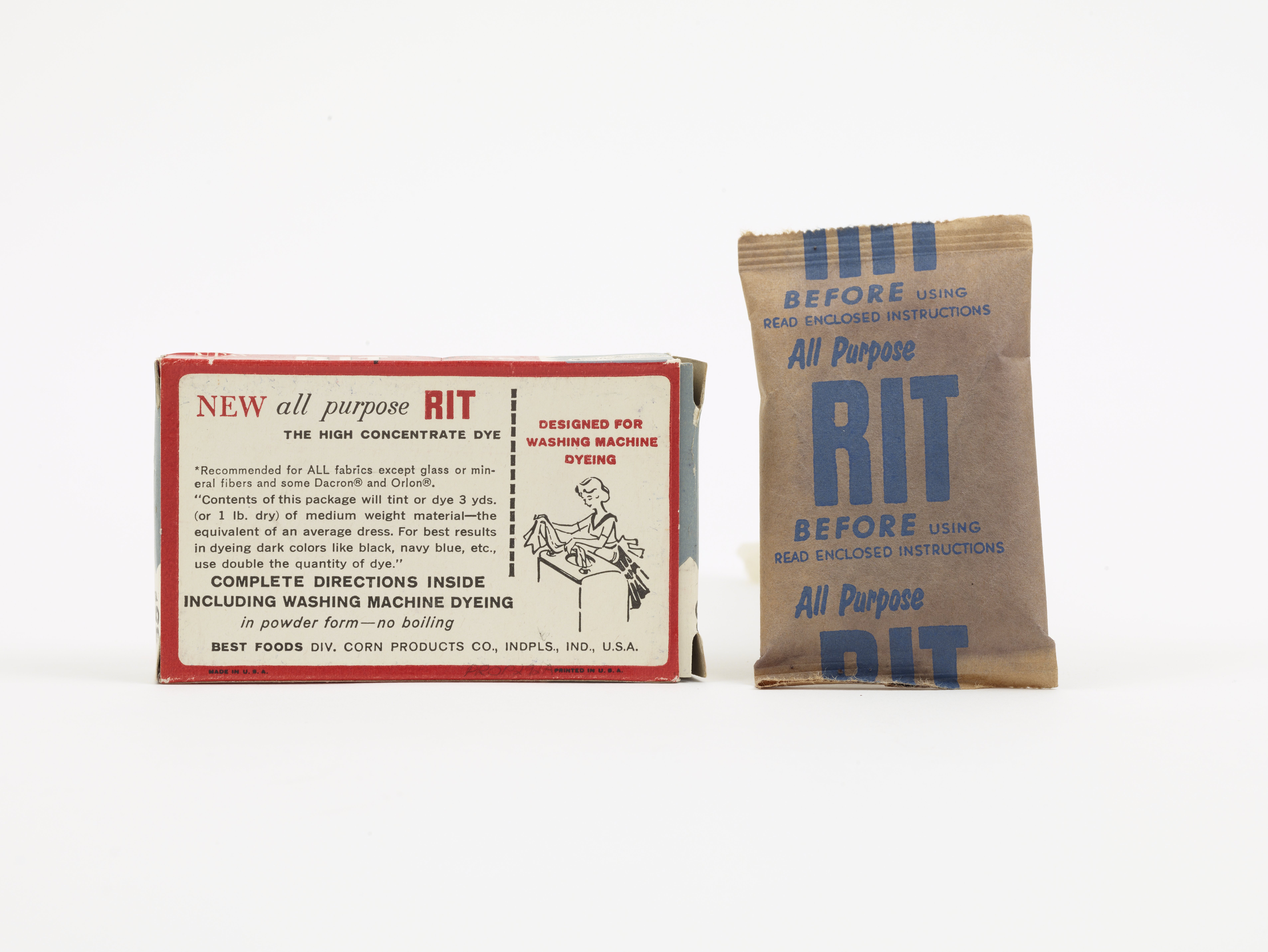 Small JPG1200 x 902px — 75.6 KBLarge JPG2880 x 2164px — 360 KBFull-sized JPG7628 x 5732px — 2.2 MBOriginal fileTIFF — 7628 x 5732px — 125 MBRed and grey fabric dye box with a paper dye packet containing Rit brand, all-purpose grey powdered fabric dye. All-Purpose Rit dye was introduced in 1941. This development gave the dye an affinity for synthetic fabrics, like nylon and rayon. Prior to this development, Rit dyes had only been successfully used on natural fabrics (like wool, cotton, linen, and silk) and did not work effectively with synthetics.