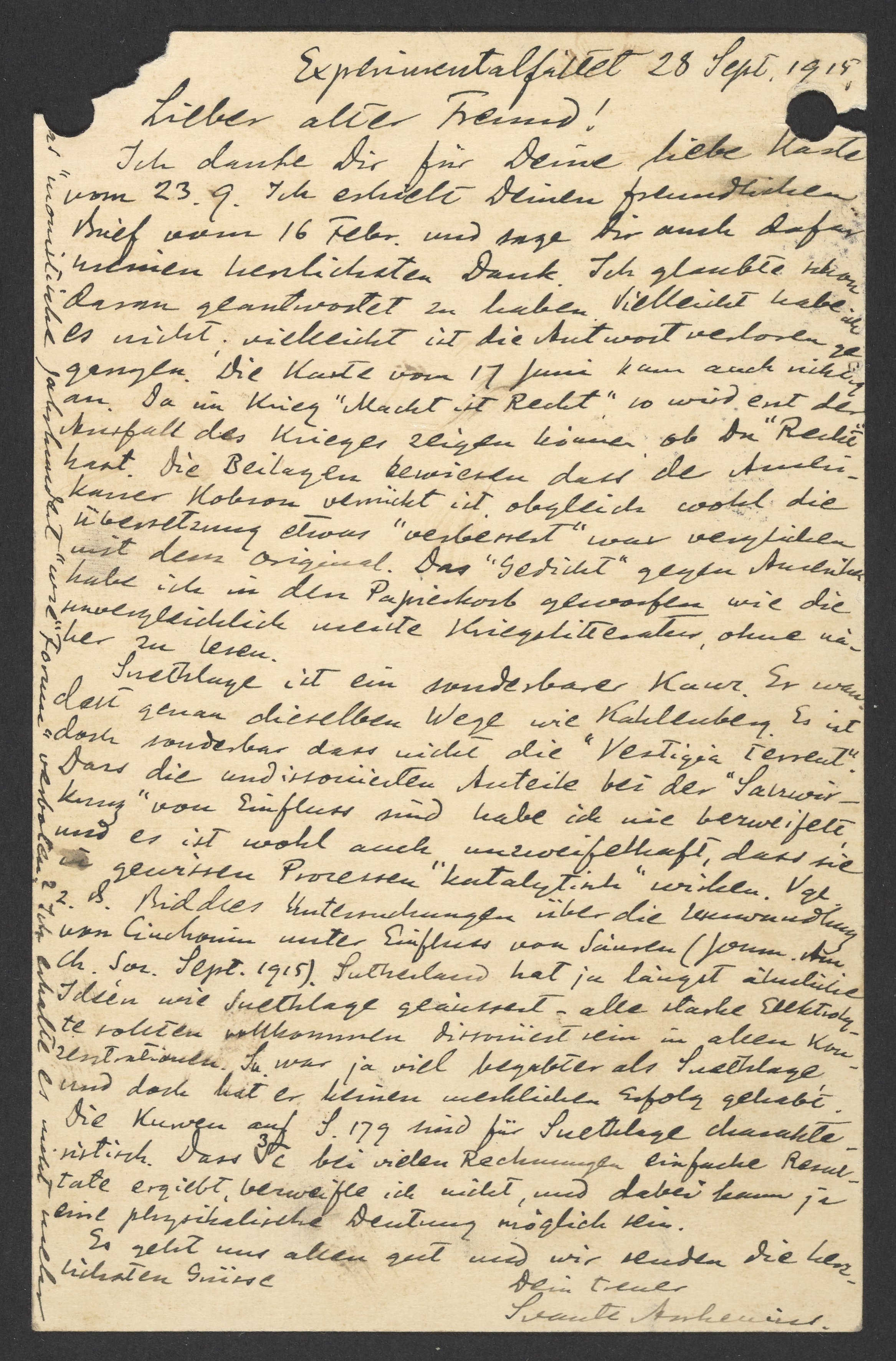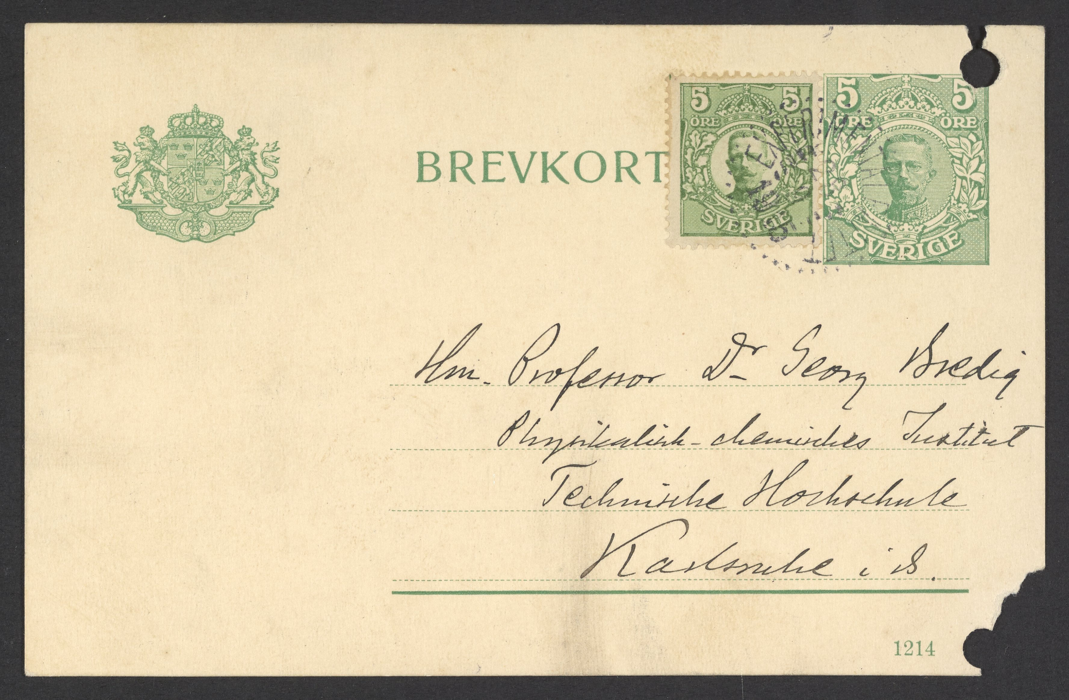 Postcard from Svante Arrhenius to Georg Bredig, September 1919