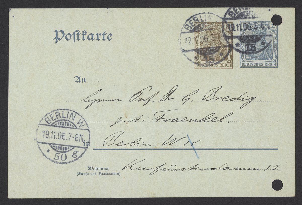 Postcard from Jacobus H. van 't Hoff to Georg Bredig, November 1906