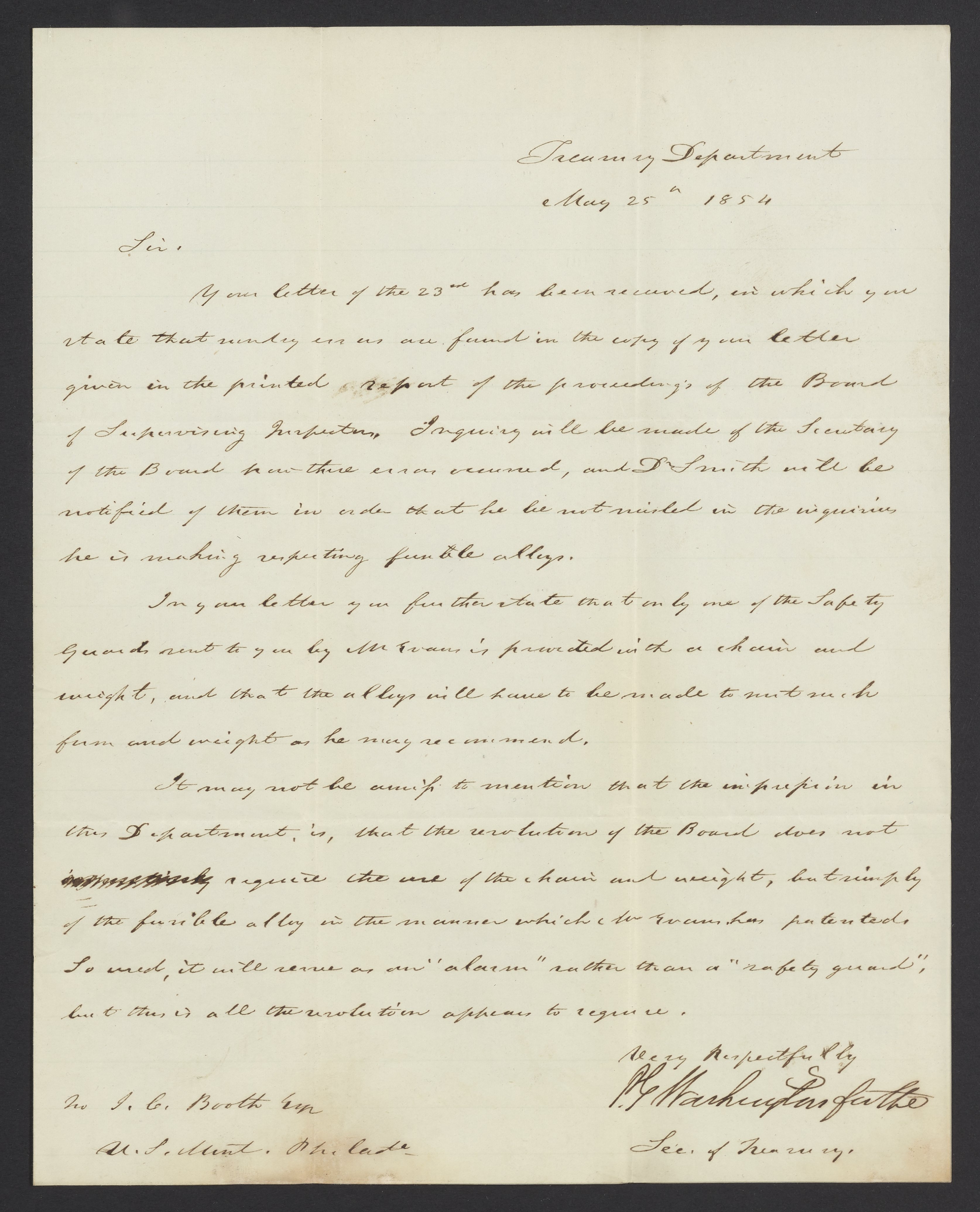 Small JPG1200 x 1484px — 206 KBLarge JPG2880 x 3562px — 978 KBFull-sized JPG3348 x 4141px — 1.2 MBOriginal fileTIFF — 3348 x 4141px — 39.7 MBJames B. Guthrie (1792 - 1869), United States Secretary of the Treasury from 1853-1857, responds to James Curtis Booth's (1810-1888) reported errors in the printed version of his report and problems with two of the three Evans Safety Guards.