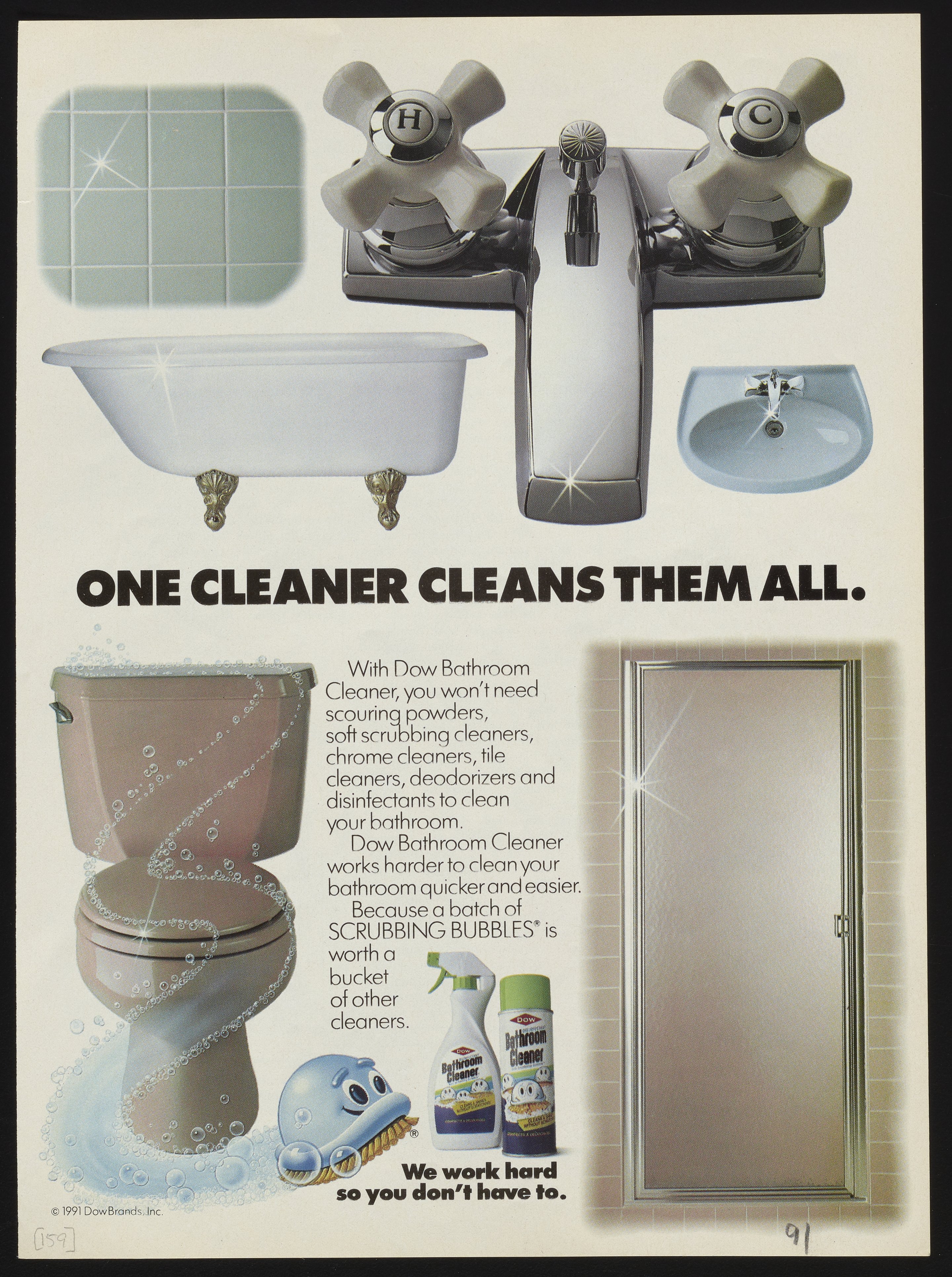 Dow Chemical Company. “One Cleaner Cleans Them All,” September 1991. Advertisements from the Dow Chemical Historical Collection, Box 7. Science History Institute. Philadelphia. https://digital.sciencehistory.org/works/cj82k8048.