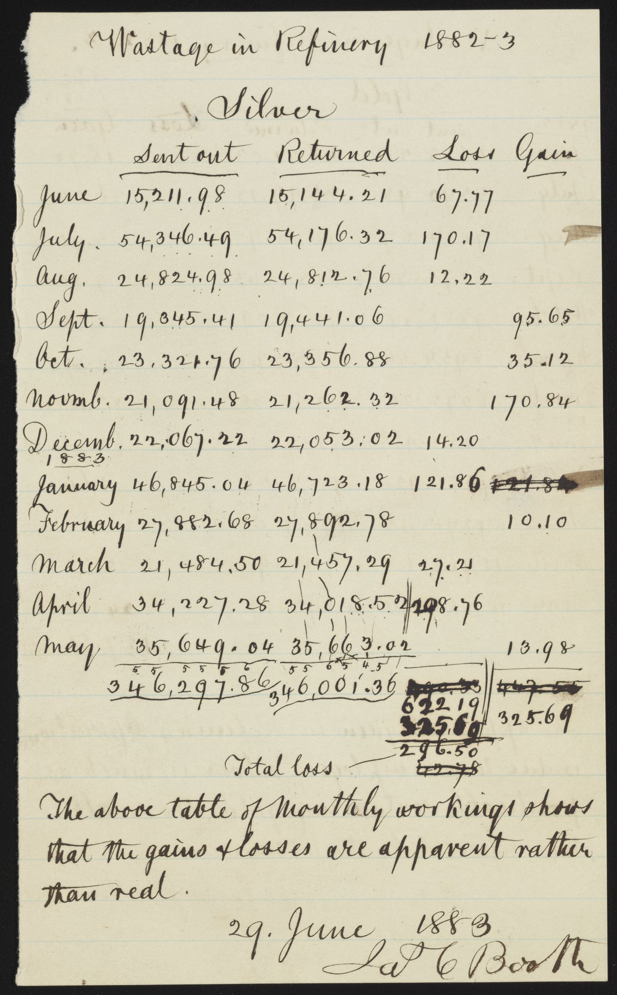 Small JPG1200 x 1933px — 362 KBLarge JPG2880 x 4640px — 1.4 MBFull-sized JPG3755 x 6050px — 2.2 MBOriginal fileTIFF — 3755 x 6050px — 65.0 MBReport on the loss of silver and gold from refinery wastage by month.