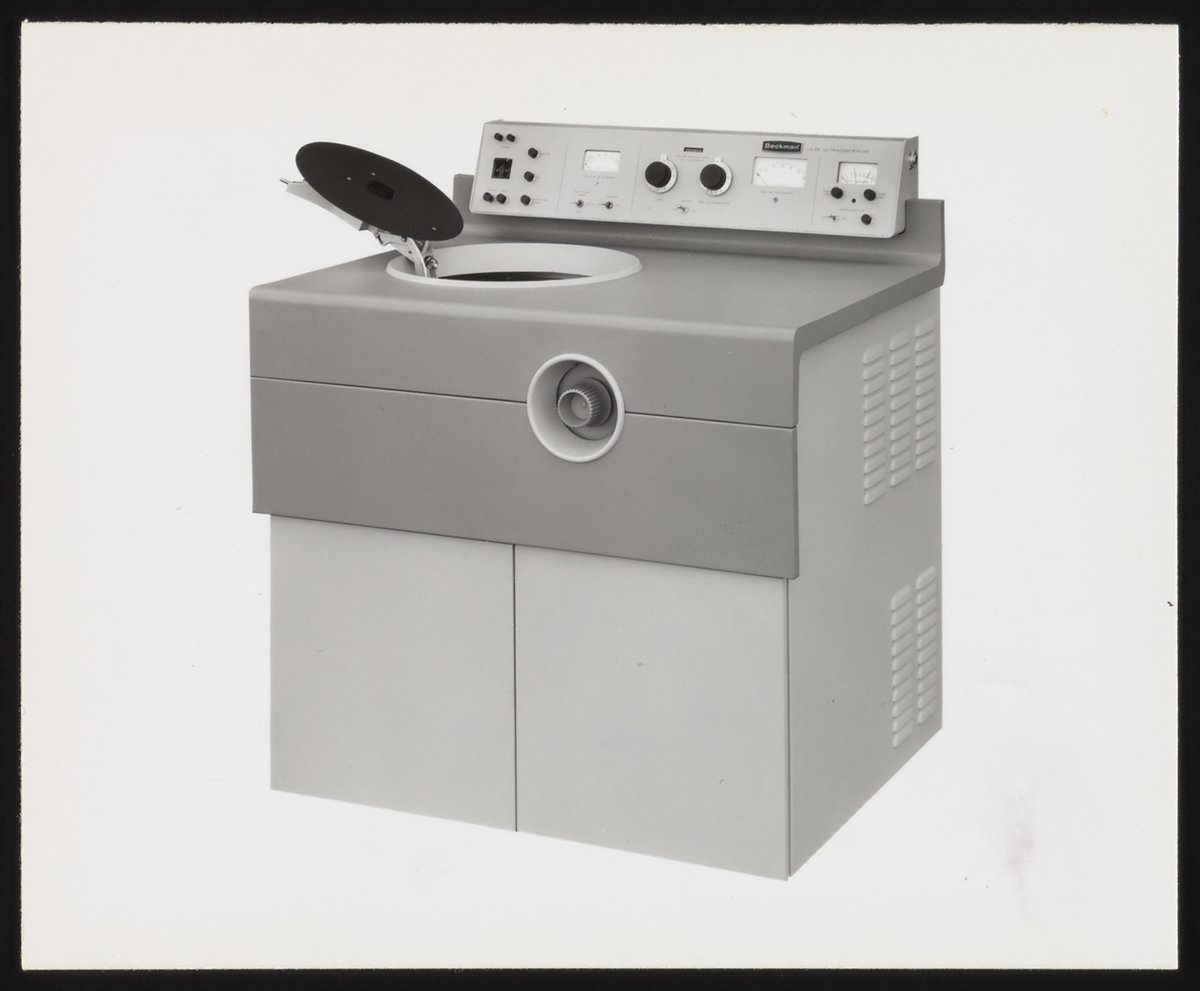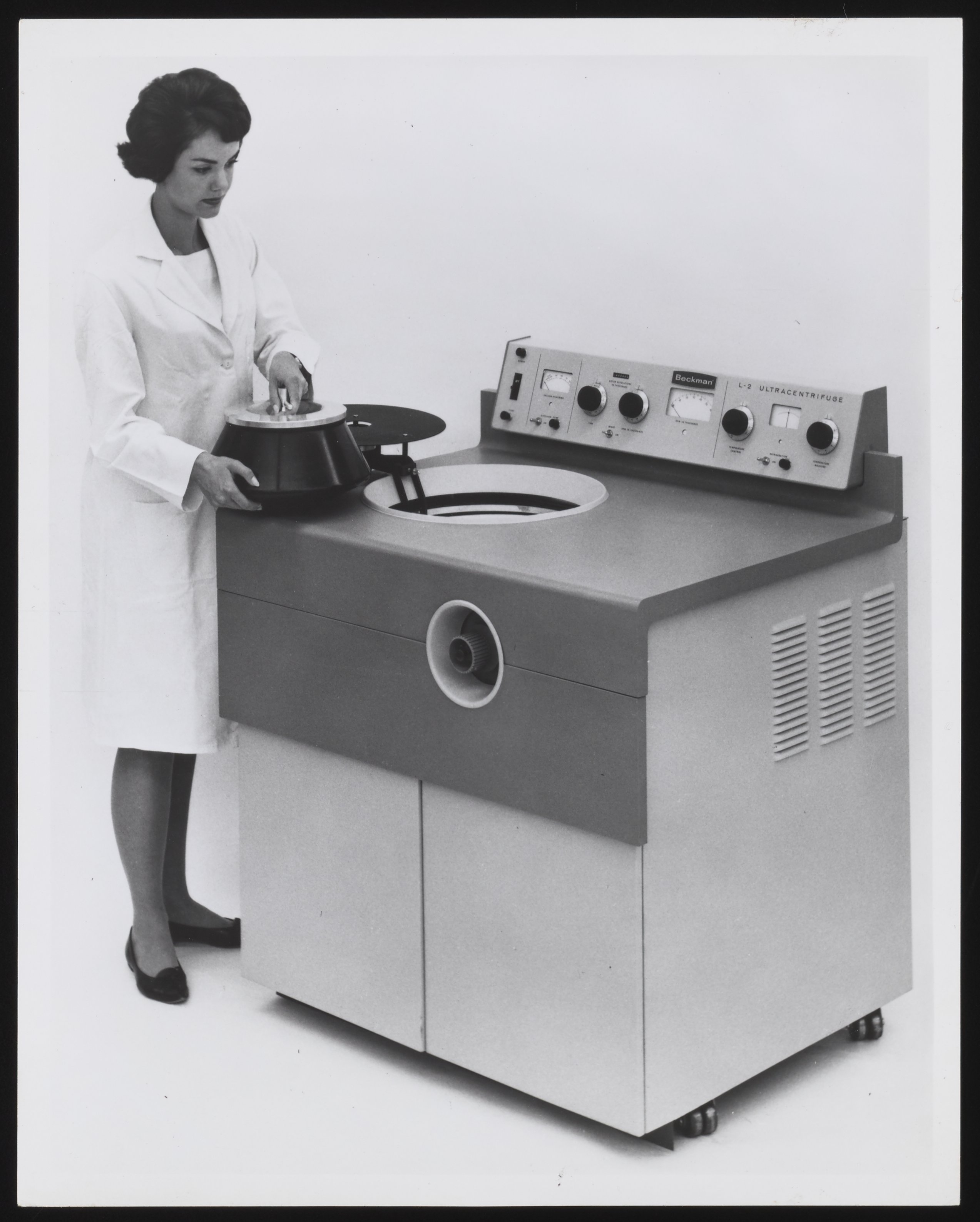Small JPG1200 x 1496px — 143 KBFull-sized JPG2546 x 3175px — 493 KBOriginal fileTIFF — 2546 x 3175px — 23.2 MBBeckman Instruments began producing centrifuges after their January 1, 1955 acquisition of industry leader, Specialized Instruments Corporation, or Spinco. With Spinco came the famous Model E Ultracentrifuge, which was developed in 1947 and was used for many important scientific discoveries of the 20th century, like the 1957 CalTech experiment that proved James Watson and Francis Crick’s theory on DNA replication.