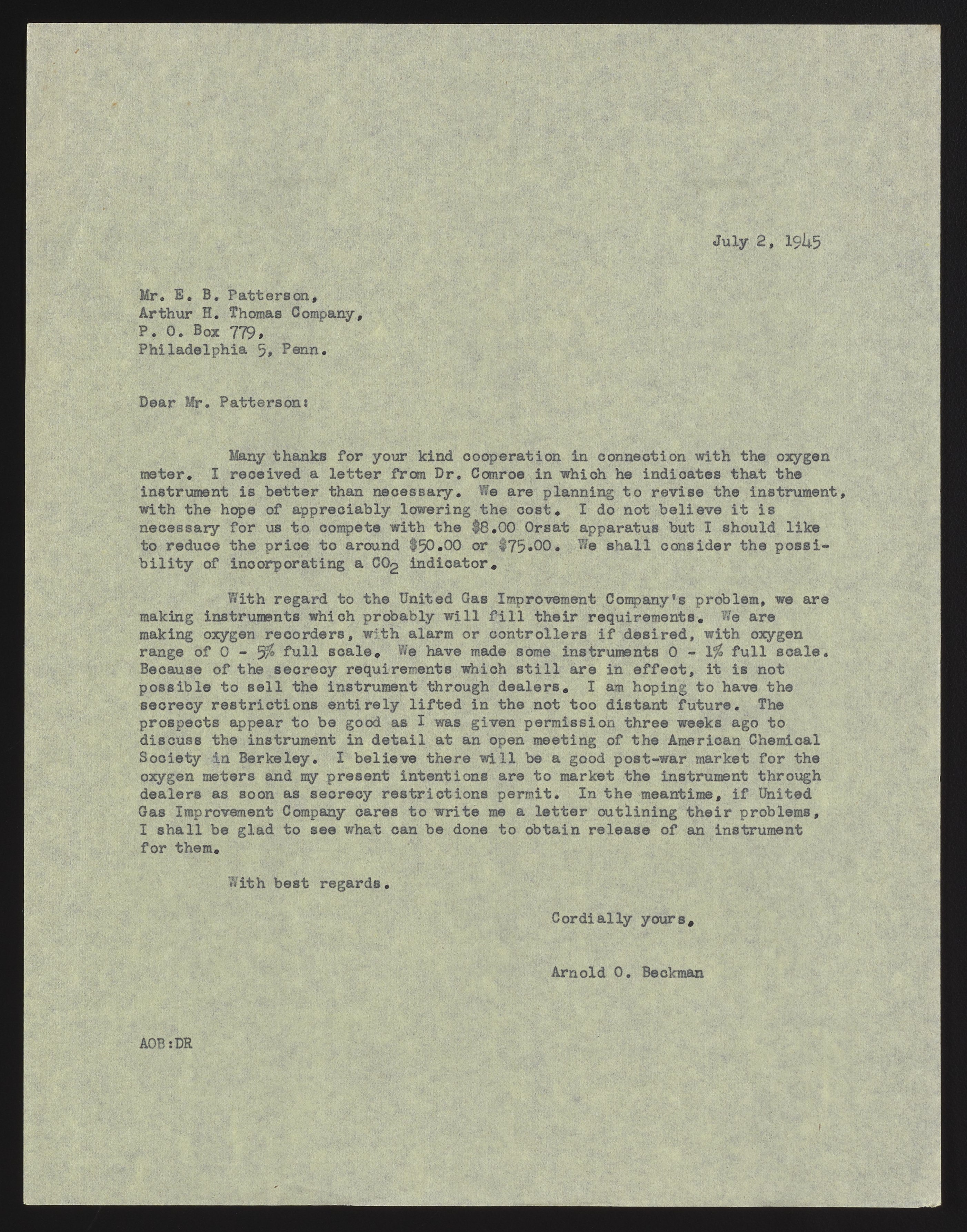 Letter from Arnold O. Beckman to E. B. Patterson