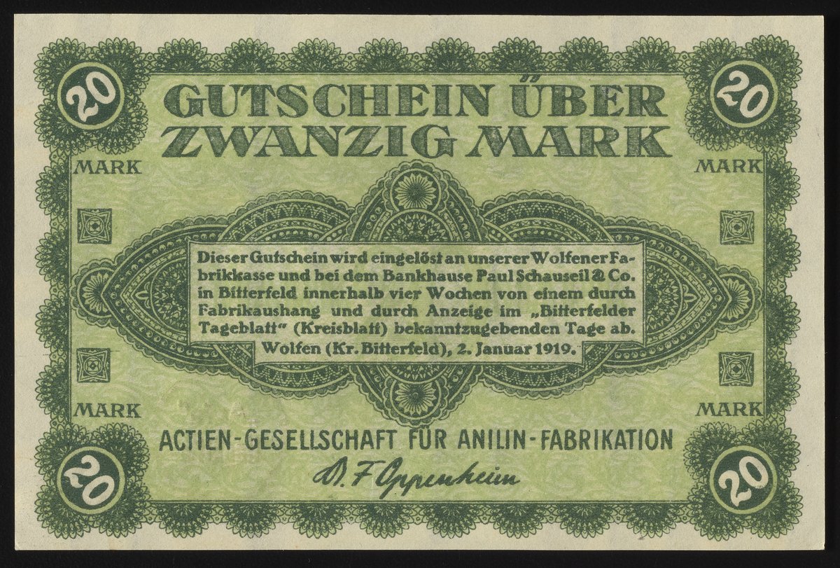 “Aktiengesellschaft Für Anilinfabrikation Twenty Mark Gutschein.” Treptow, Berlin, Germany: Aktiengesellschaft für Anilinfabrikation, January 2, 1919. Robert J. Bauman collection. Science History Institute. Philadelphia. https://digital.sciencehistory.org/works/cn69m517v.