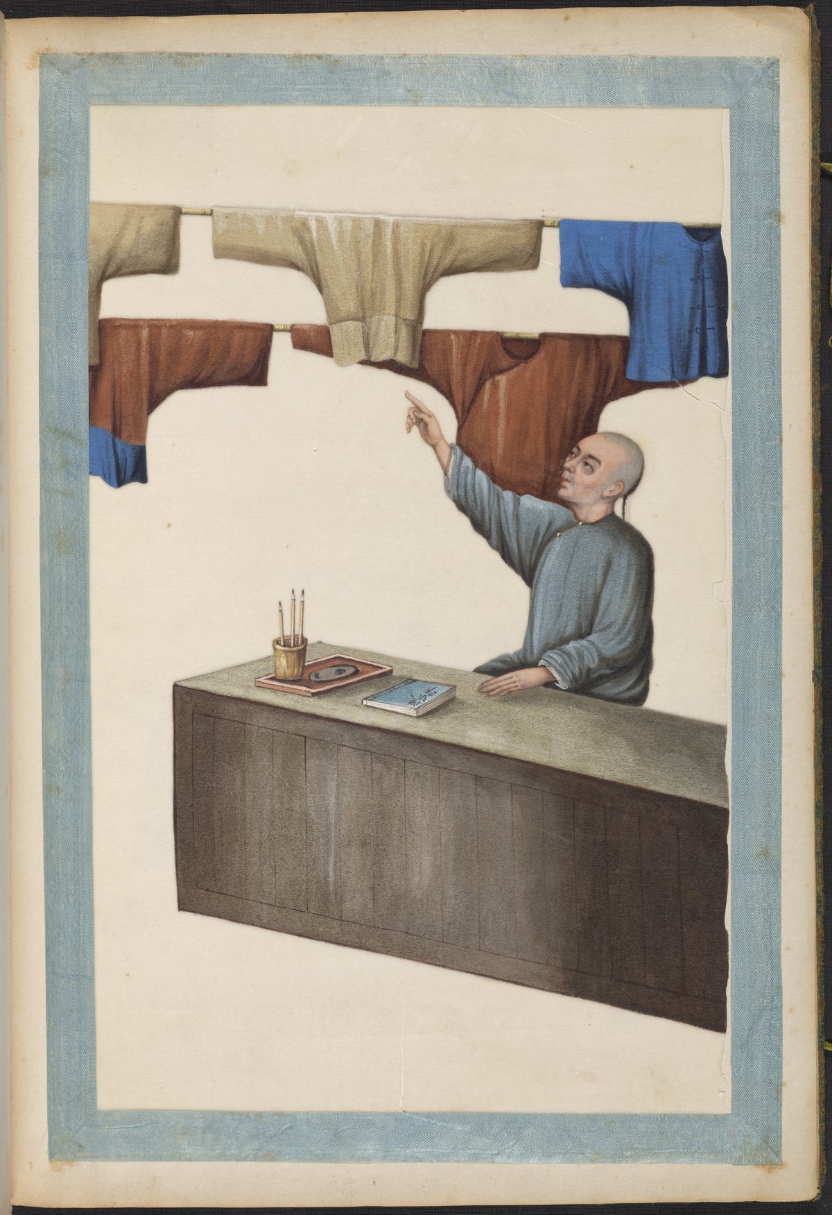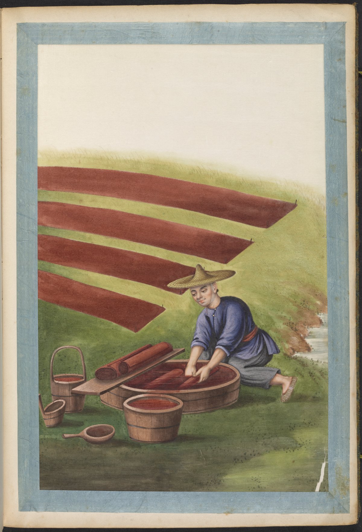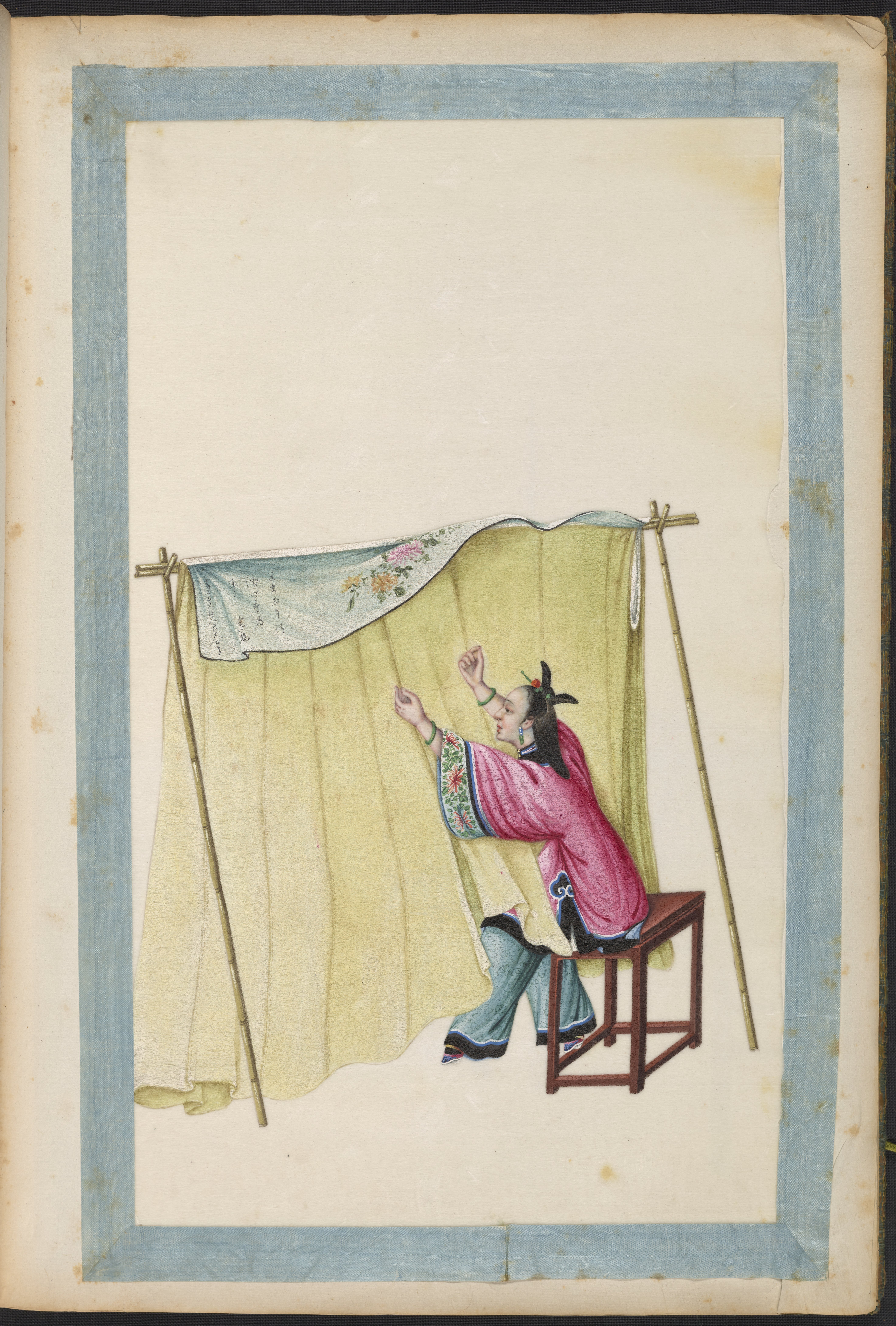 Small JPG1200 x 1740px — 349 KBLarge JPG2880 x 4175px — 2.1 MBFull-sized JPG6002 x 8701px — 8.6 MBOriginal fileTIFF — 6002 x 8701px — 149 MBVolume five of five brocade-bound sets of 60 Chinese watercolor paintings. The watercolors show, in chronological order, the process of producing Ramie cloth, a silk-like fabric, in China during the 1820s. The collection is accompanied by a transcription of hand-written text, describing the steps in Ramie cloth production. These works are part of a long lineage of works by Chinese artists that depict the various processes in the production of materials from China.