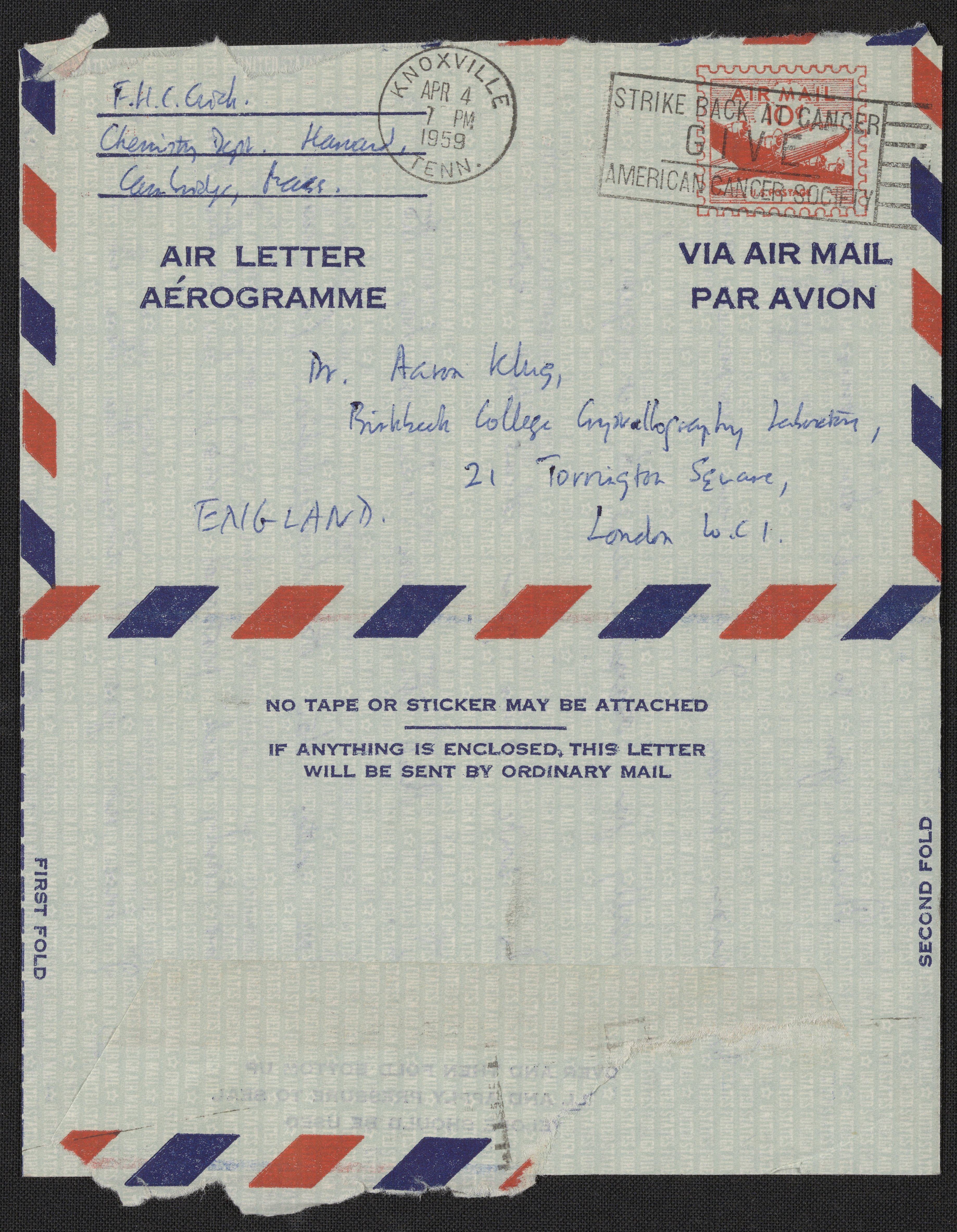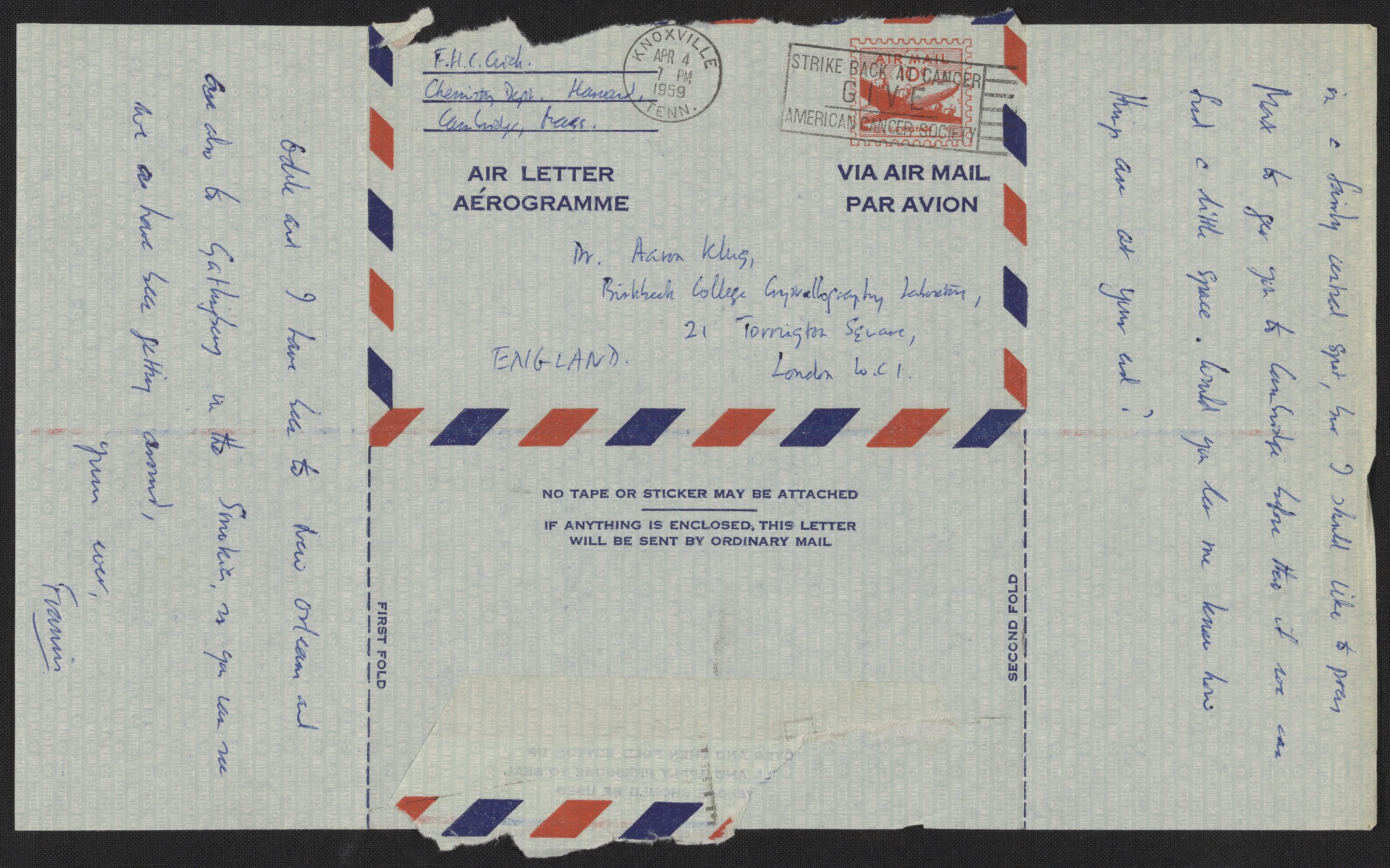 Letter from Francis Crick to Aaron Klug, April 4, 1959