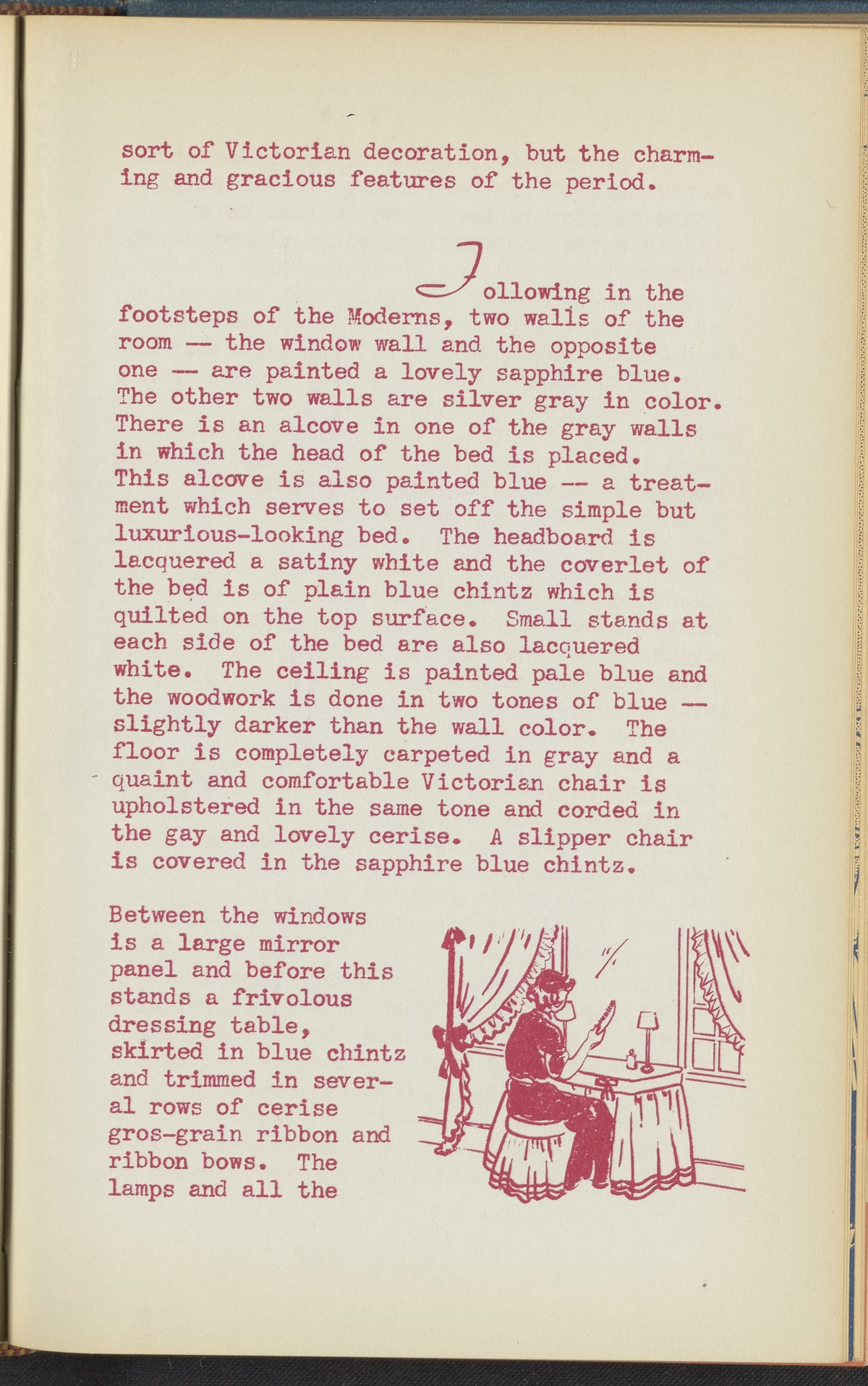Booklet corresponding to a radio broadcast program created by the National Paint, Varnish, and Lacquer Association. The booklet discusses how to determine a harmonious color scheme when redecorating a bedroom. Describes several bedroom design schemes for inspiration. Includes small stylized illustrations throughout and decorated covers.