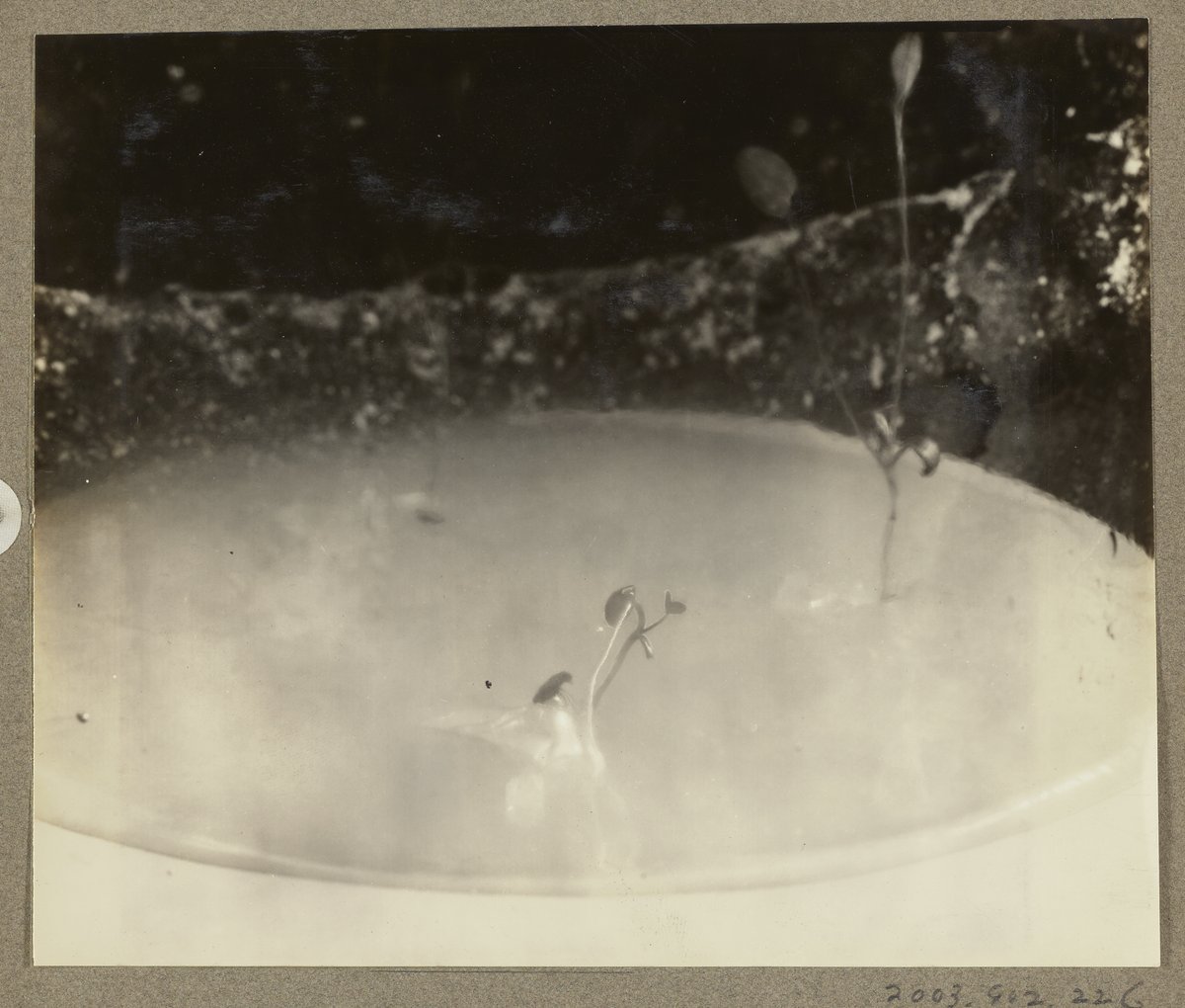 Close-up view of an alsike clover plant at the U.S. Department of Agriculture's Fixed Nitrogen Research Laboratory located in Washington, D.C. Notably, the root of the plant is growing from the pedicel (i.e. the stem that attaches a single flower to the complete flower head of a plant) of one cotyledon (i.e. an embryonic leaf in seed-bearing plants, one or more of which are the first leaves to appear from a germinating seed).