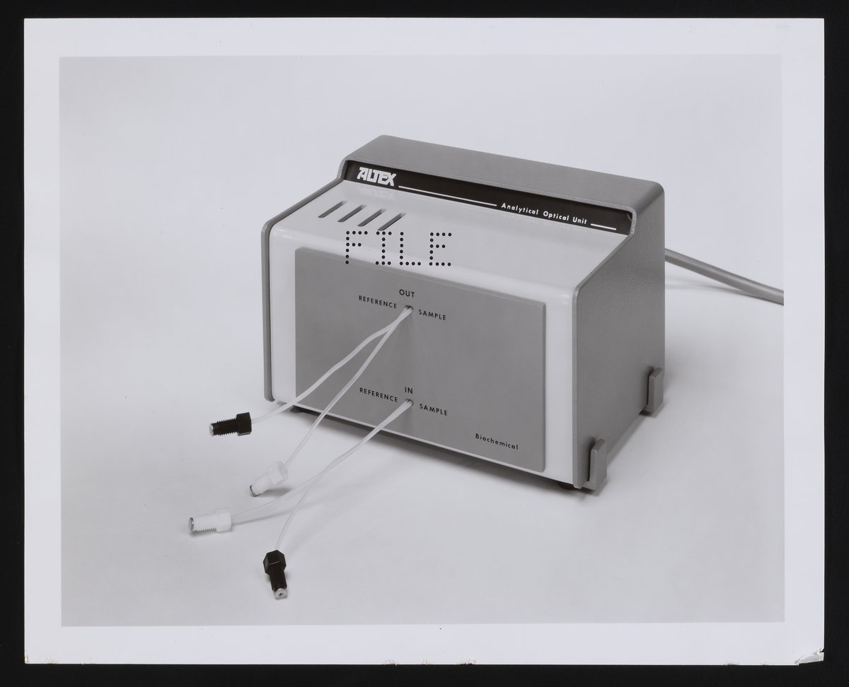 Herrington-Olson Photography. “Altex Analytical Optical Unit,” circa 1978. Beckman Historical Collection, Box 83. Science History Institute. Philadelphia. https://digital.sciencehistory.org/works/cr56n107n.